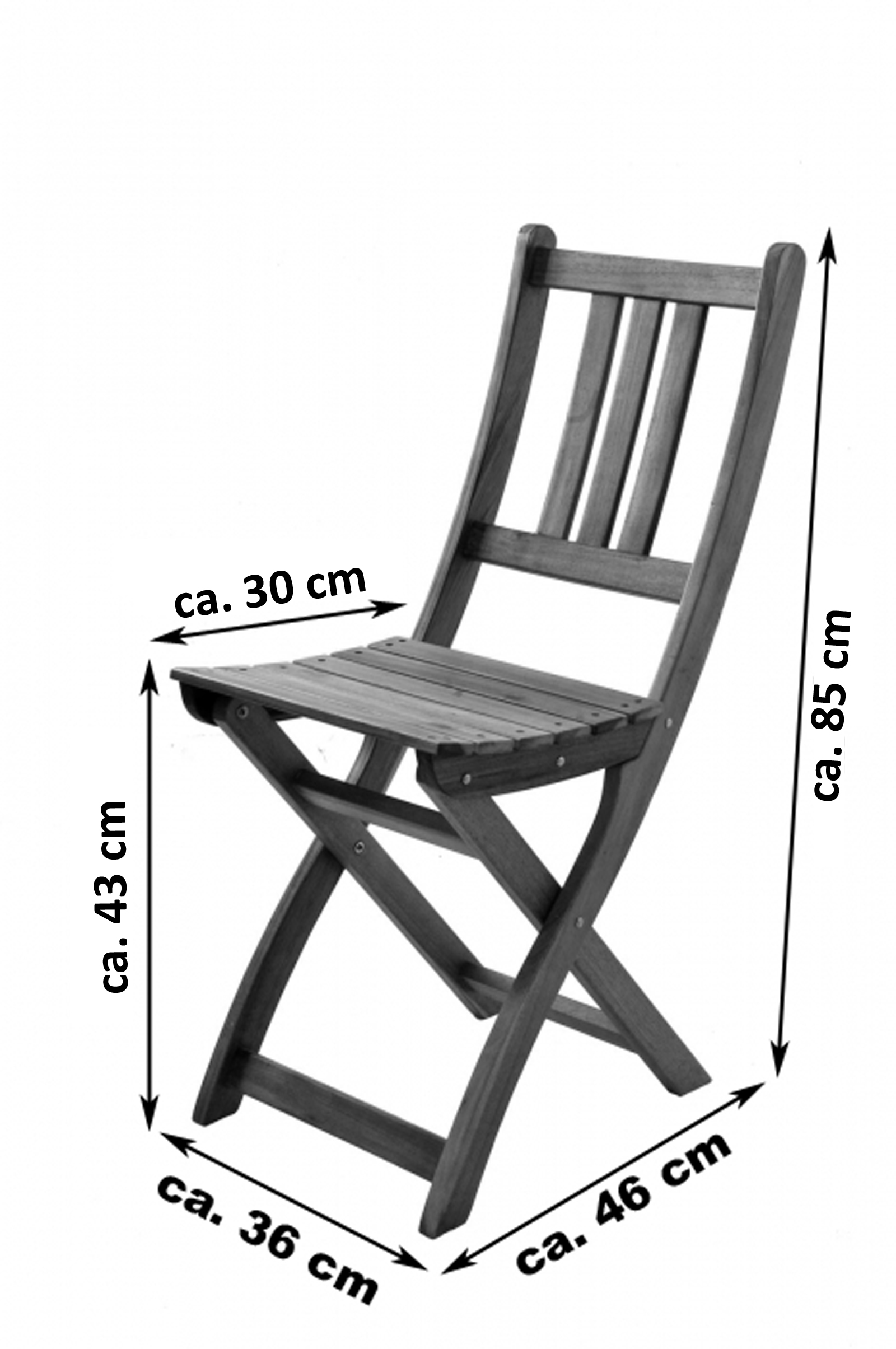 - Stuhl: Gesamthöhe: ca. 85 cm; Sitzbreite: ca. 36 cm; Sitztiefe: ca. 30 cm; Gesamttiefe: ca. 46 cm; Lehnenhöhe: ca. 47 cm (von der Sitzfläche aus); Sitzhöhe: ca. 43 cm