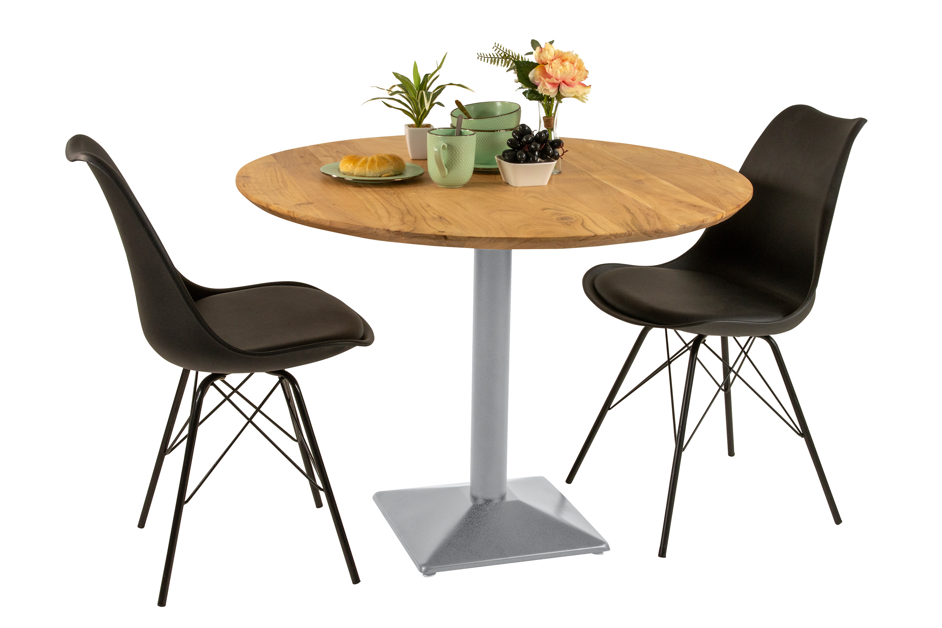 Bistrotisch Brasilia, rund 100 x 100 cm, Akazienholz massiv + naturfarben, Schweizer Kante, Säulengestell Metall Silber