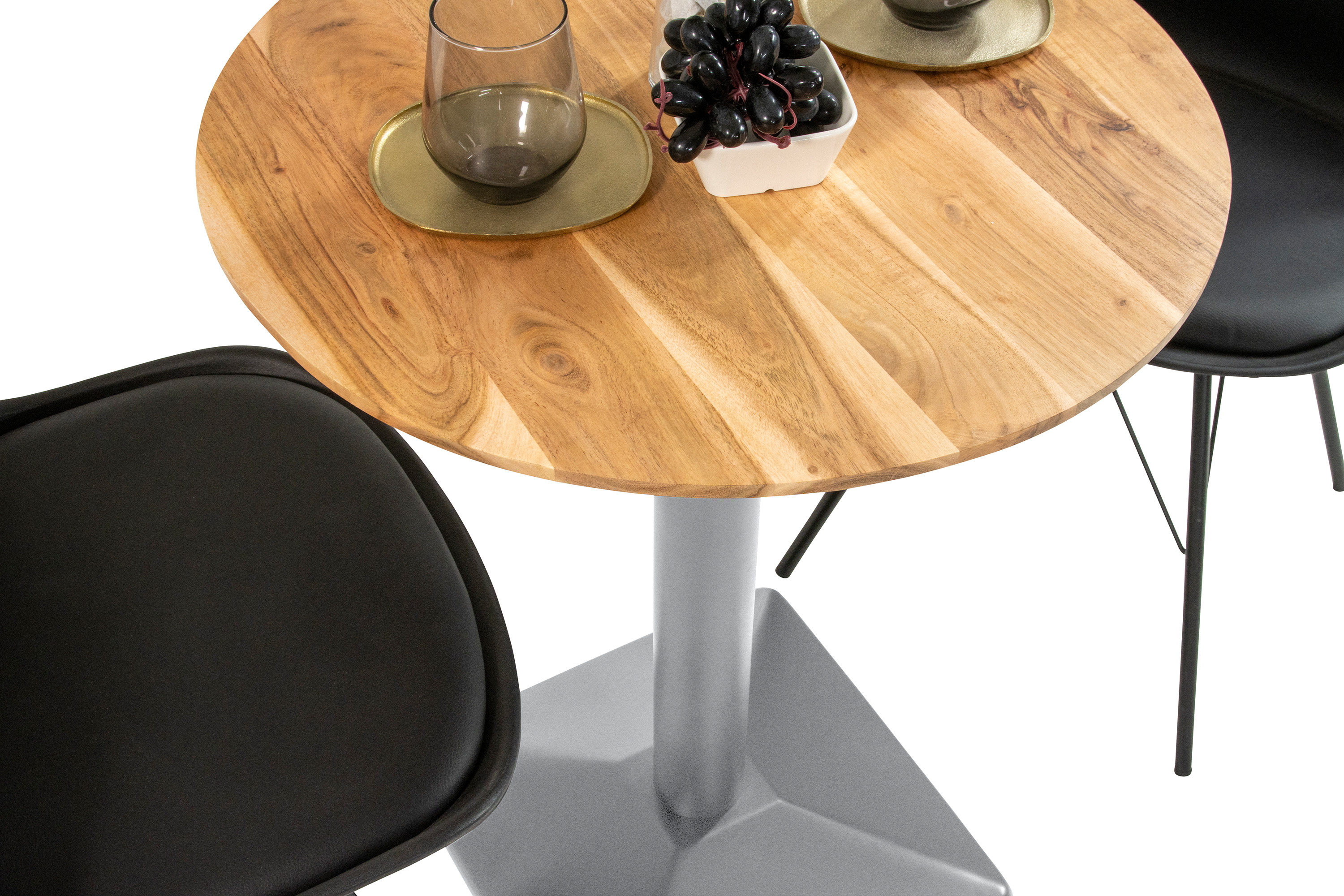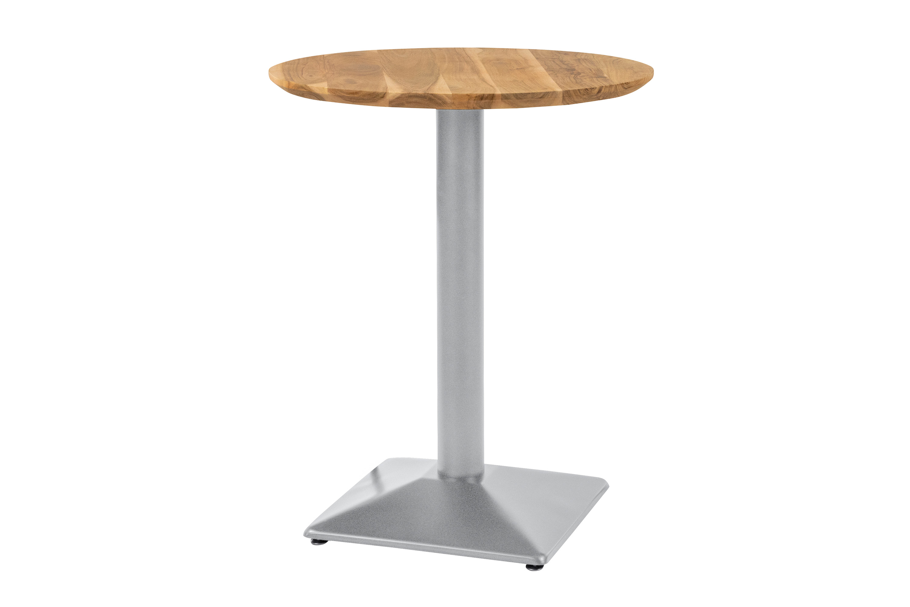 Bistrotisch Brasilia, rund 70 x 70 cm, Akazienholz massiv + naturfarben, Schweizer Kante, Säulengestell Metall Silber