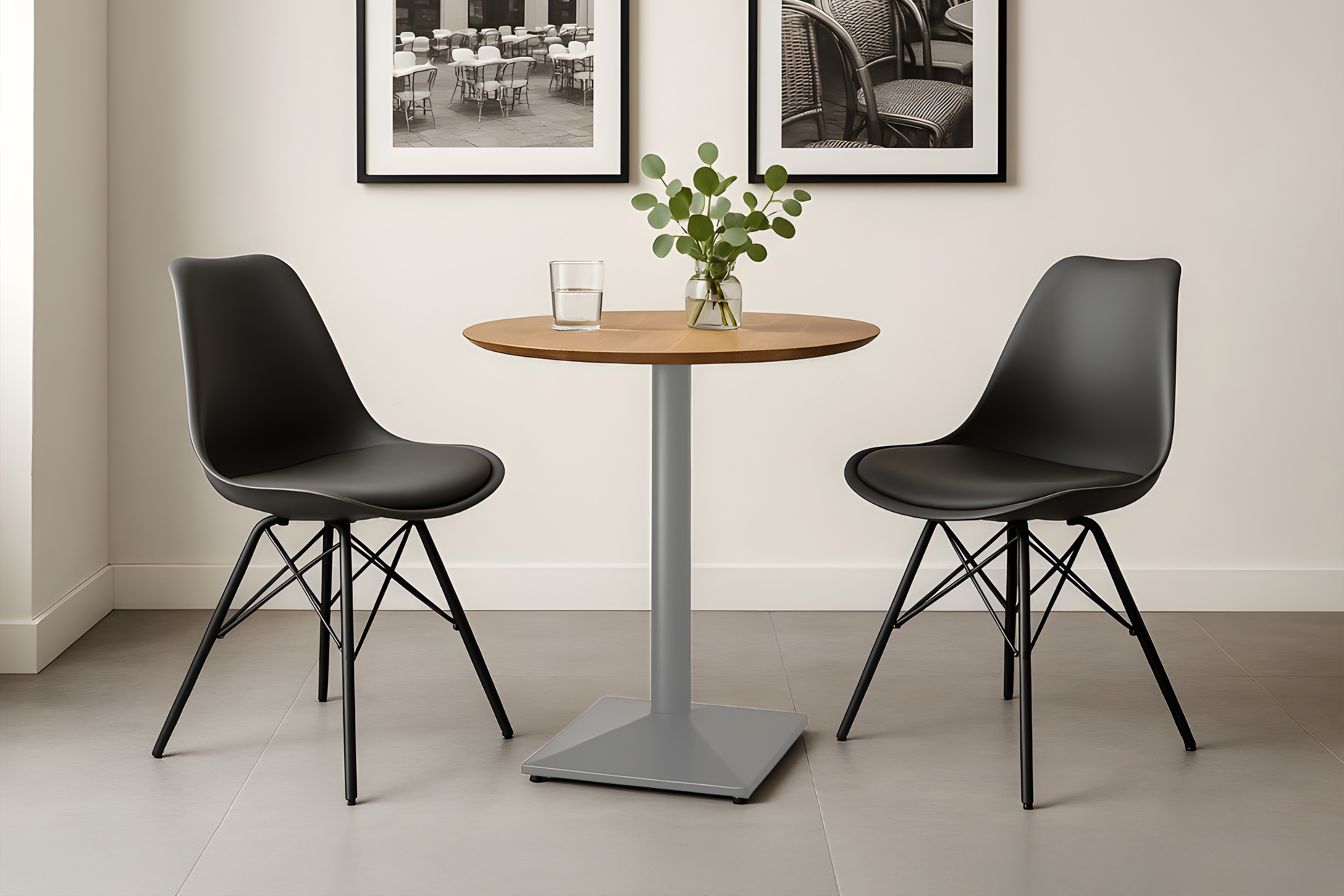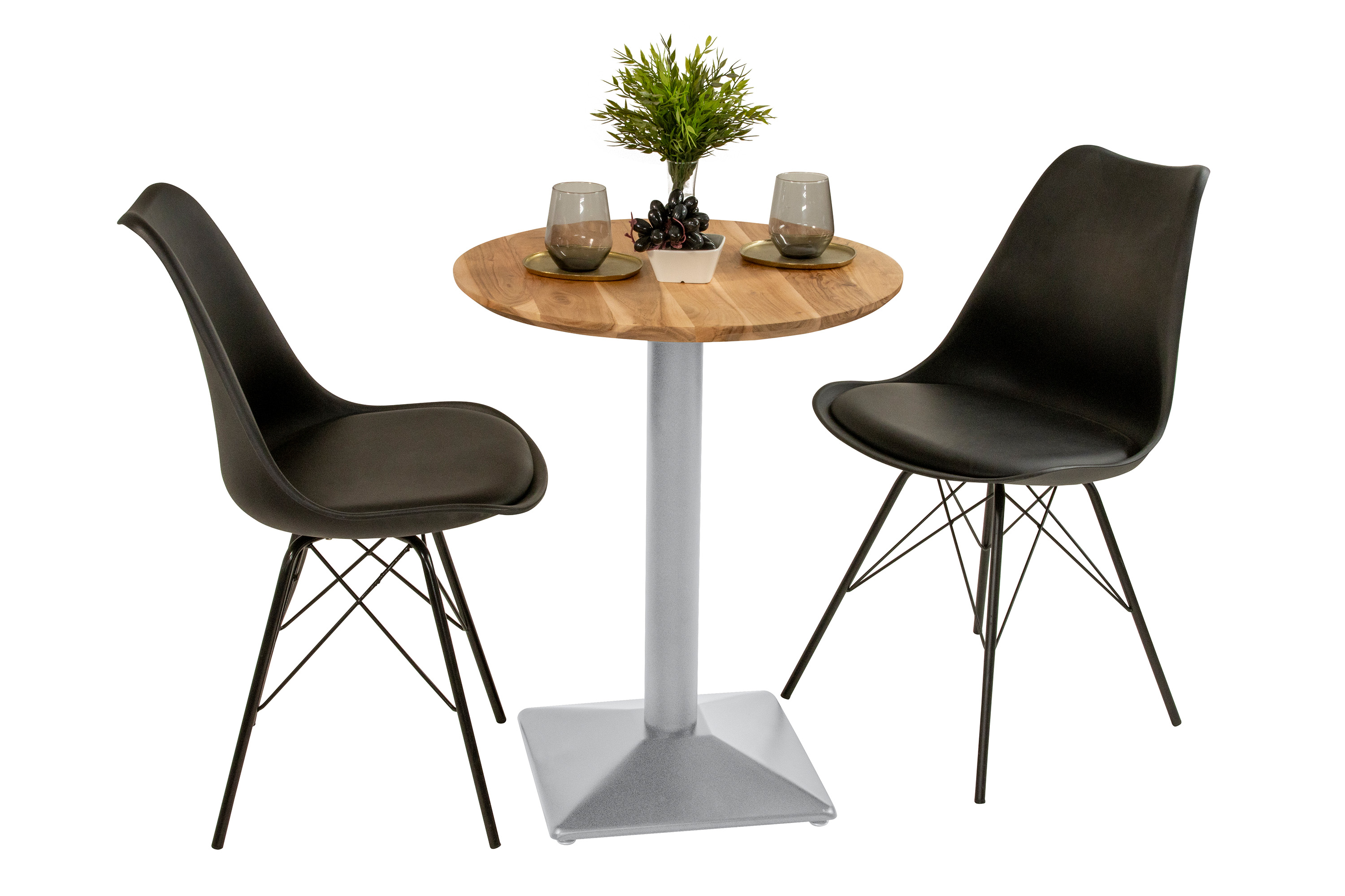 Der runde Bistrotisch wird von einem schlichten, silber lackierten Säulengestell getragen, das sich dezent zurücknimmt und gleichzeitig für sicheren Stand sorgt. Die reduzierte Form passt sich jeder Einrichtung mühelos an und lässt den natürlichen Charme der Holzplatte für sich sprechen.