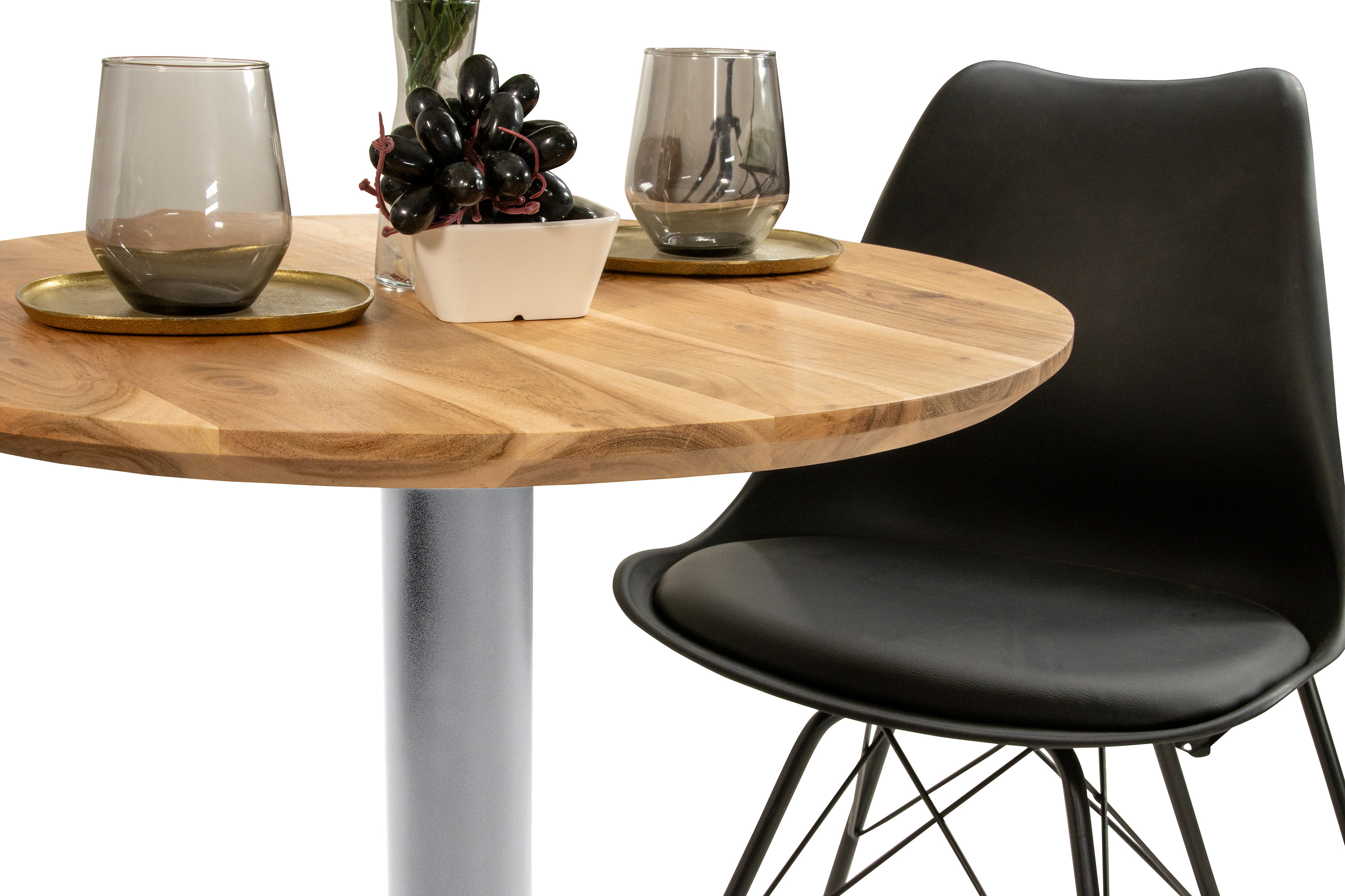 Ob für die kleine Frühstücksecke, das gemütliche Dinner zu zweit oder als eleganter Blickfang im Wohnbereich – der runde Bistrotisch Brasilia vereint stilvolle Natürlichkeit mit modernem Design. Die Tischplatte aus massivem Akazienholz lädt zum Verweilen ein, während das silbere Säulengestell für Stabilität und einen zeitlos eleganten Look sorgt. Ein hochwertiger Holztisch, der Ästhetik, Funktionalität und Gemütlichkeit perfekt miteinander verbindet.