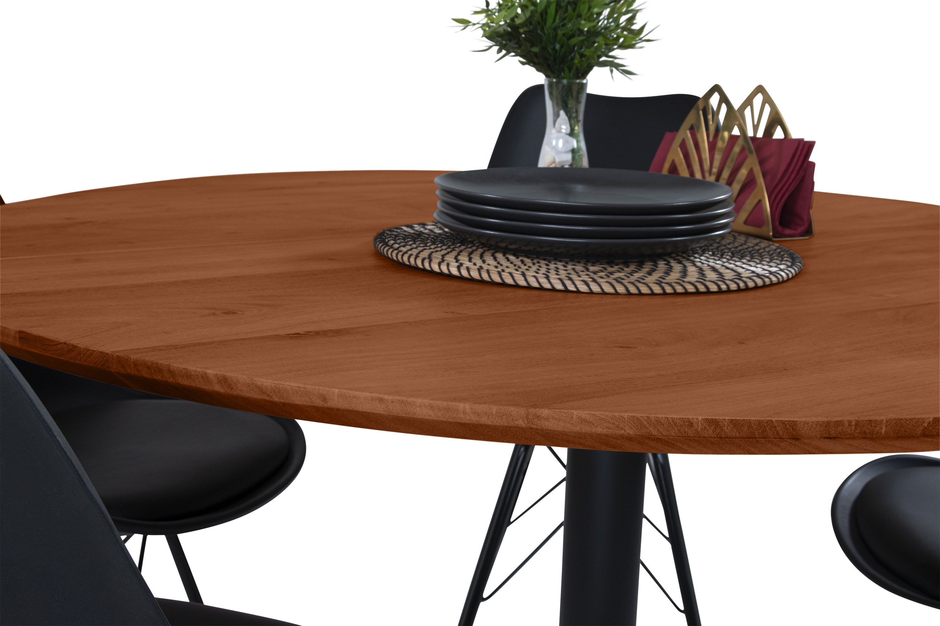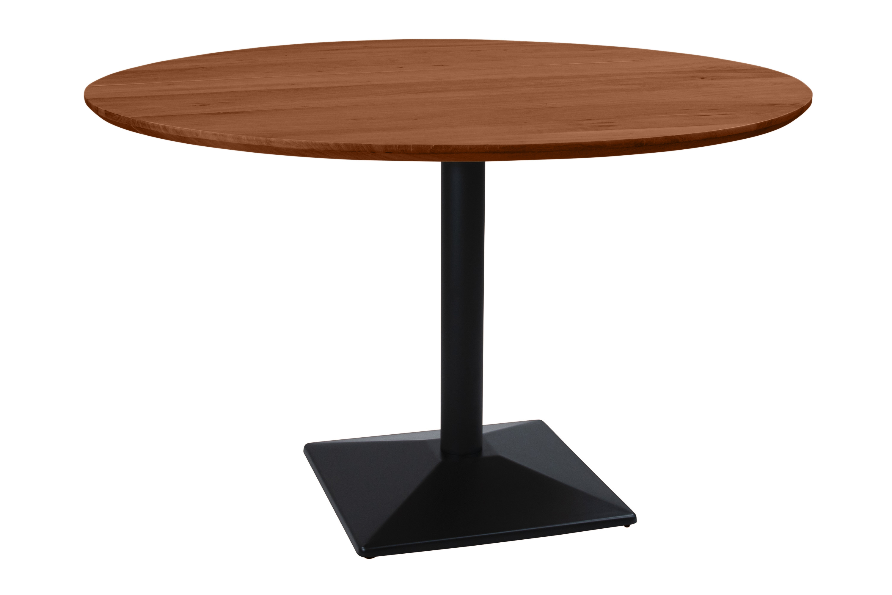 Bistrotisch Brasilia, rund 120 x 120 cm, Akazienholz massiv + nussbaumfarben, Schweizer Kante, Säulengestell Metall Schwarz