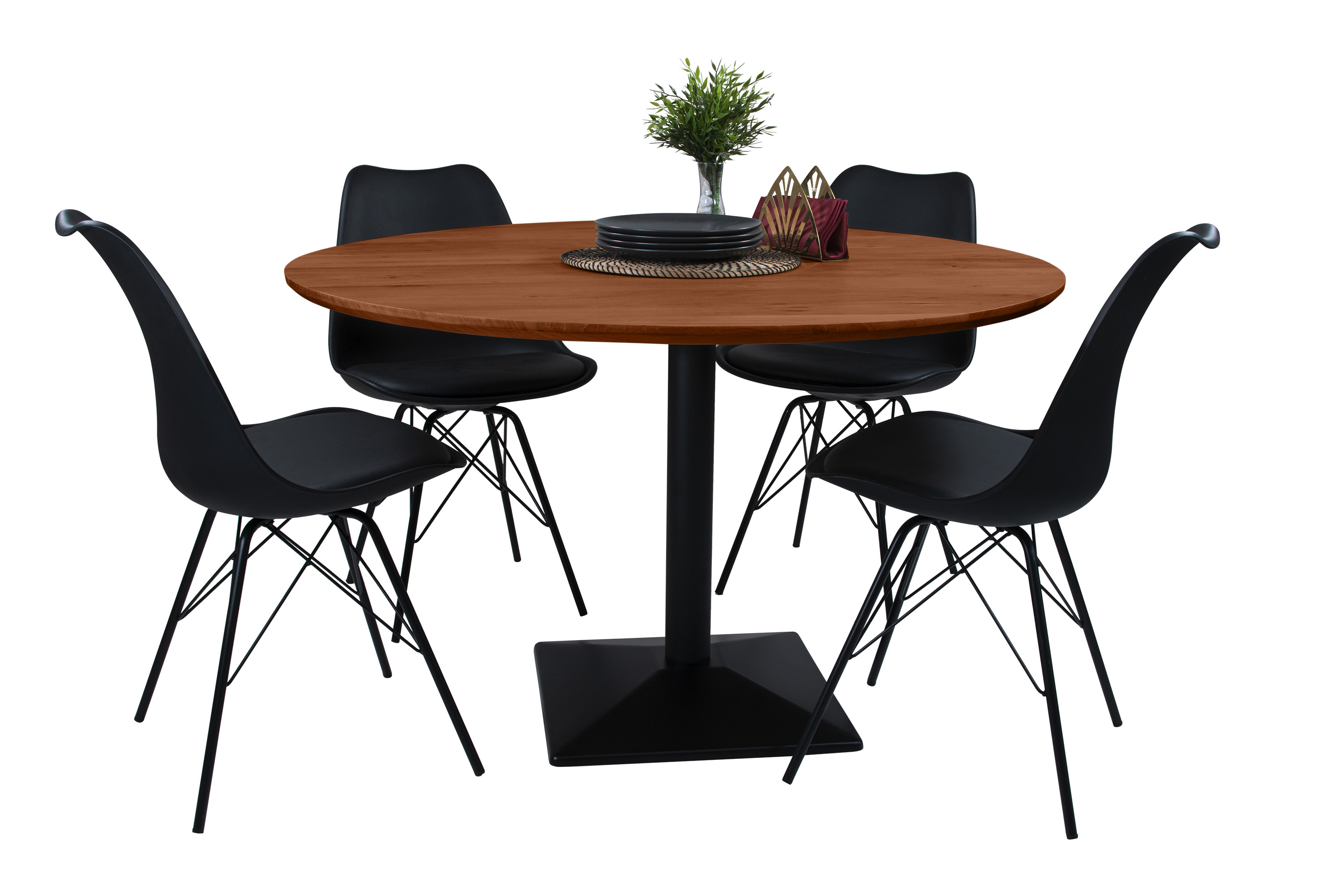 Der runde Bistrotisch wird von einem schlichten, schwarz lackierten Säulengestell getragen, das sich dezent zurücknimmt und gleichzeitig für sicheren Stand sorgt. Die reduzierte Form passt sich jeder Einrichtung mühelos an und lässt den natürlichen Charme der Holzplatte für sich sprechen.