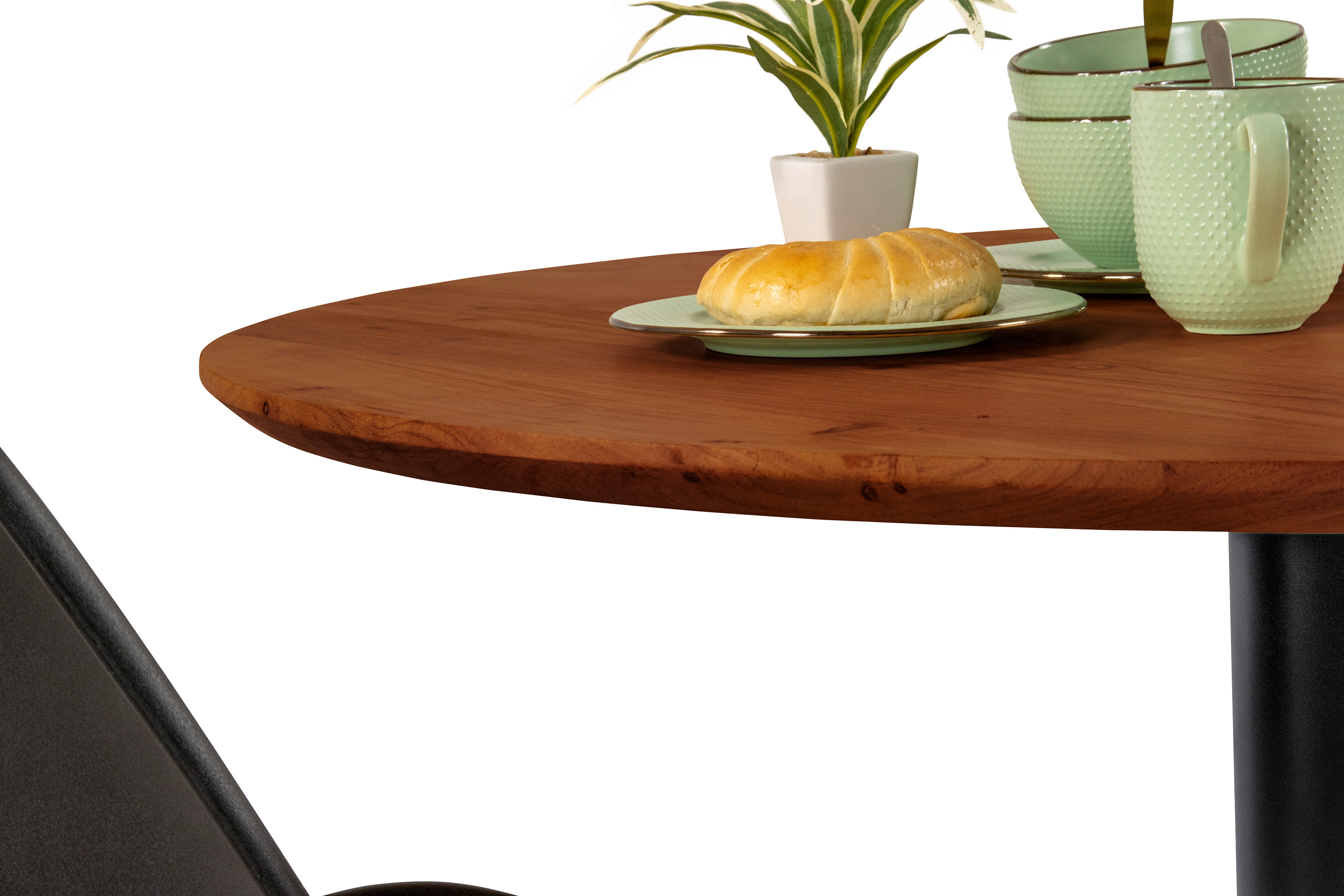 Ob für die kleine Frühstücksecke, das gemütliche Dinner zu zweit oder als eleganter Blickfang im Wohnbereich – der runde Bistrotisch Brasilia vereint stilvolle Natürlichkeit mit modernem Design. Die Tischplatte aus massivem Akazienholz lädt zum Verweilen ein, während das schwarze Säulengestell für Stabilität und einen zeitlos eleganten Look sorgt. Ein hochwertiger Holztisch, der Ästhetik, Funktionalität und Gemütlichkeit perfekt miteinander verbindet.