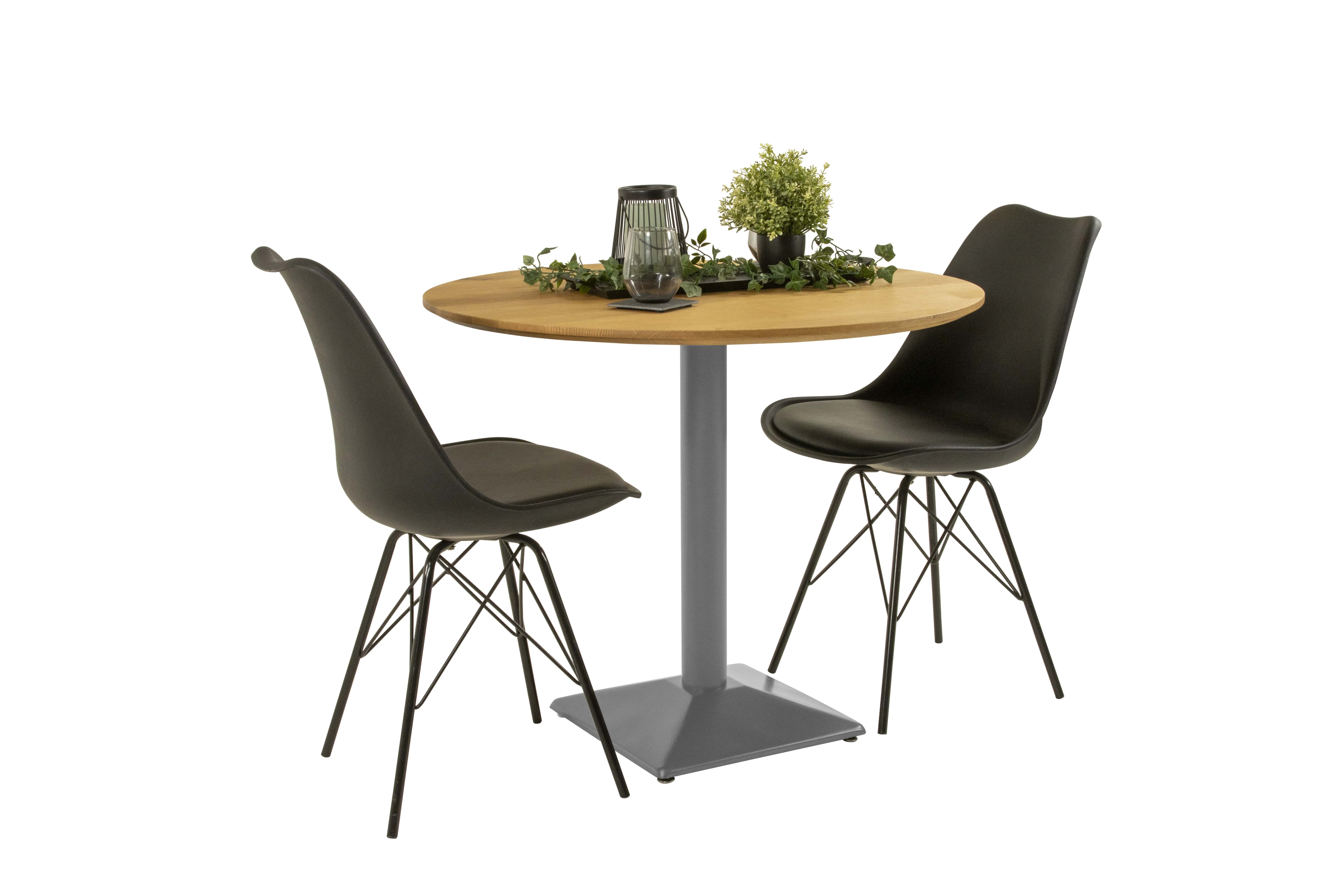 Der runde Bistrotisch wird von einem schlichten, silber lackierten Säulengestell getragen, das sich dezent zurücknimmt und gleichzeitig für sicheren Stand sorgt. Die reduzierte Form passt sich jeder Einrichtung mühelos an und lässt den natürlichen Charme der Holzplatte für sich sprechen.
