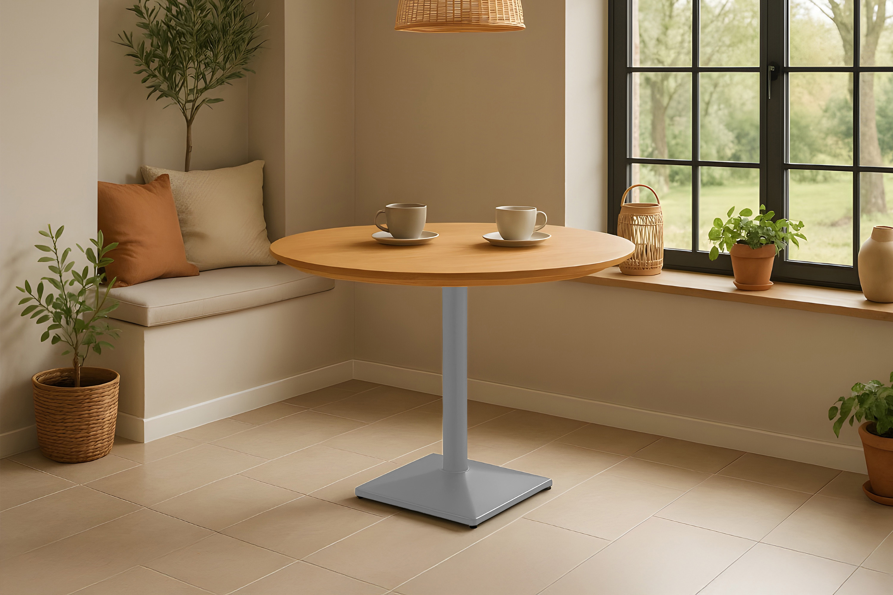 Der runde Bistrotisch wird von einem schlichten, silber lackierten Säulengestell getragen, das sich dezent zurücknimmt und gleichzeitig für sicheren Stand sorgt. Die reduzierte Form passt sich jeder Einrichtung mühelos an und lässt den natürlichen Charme der Holzplatte für sich sprechen.