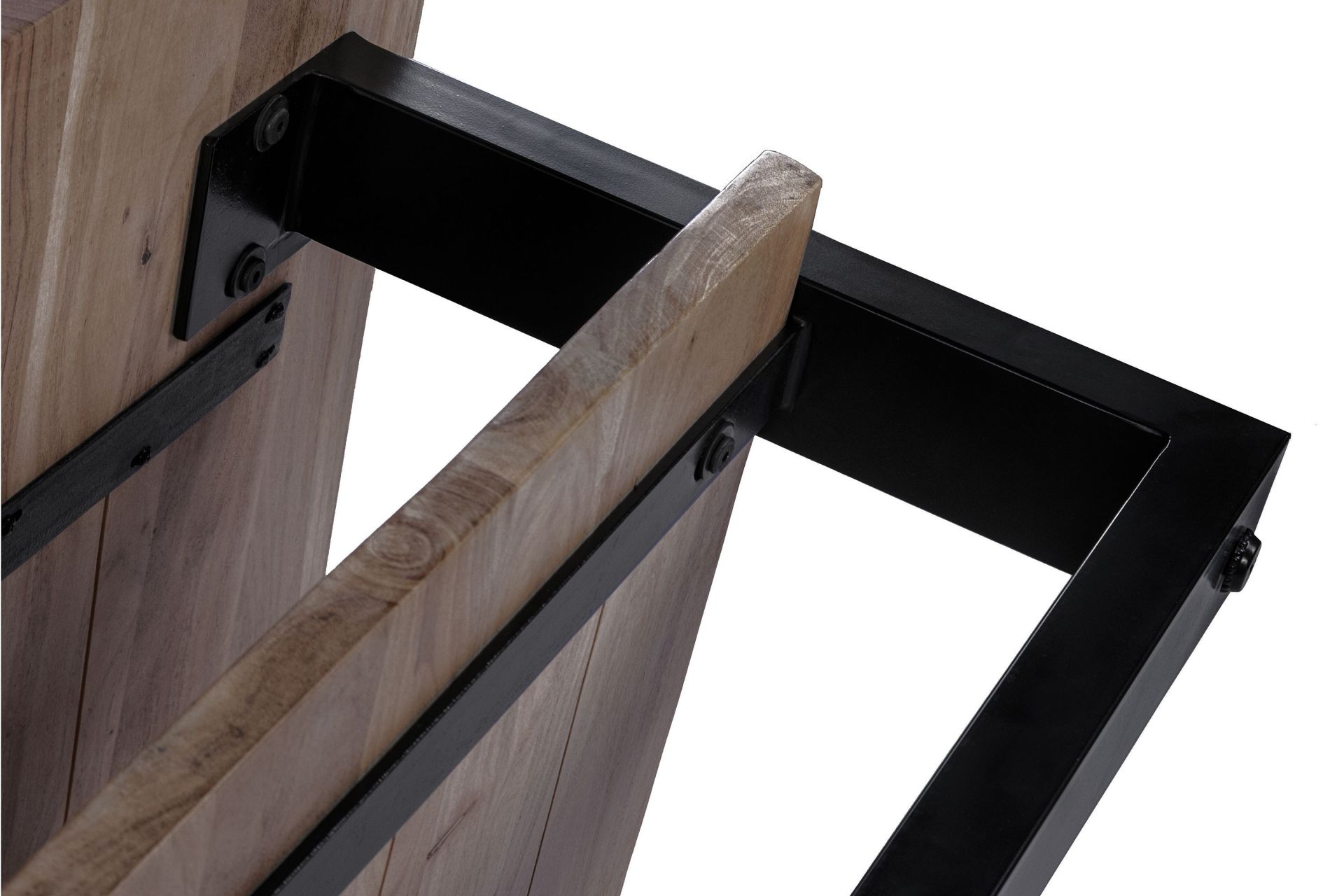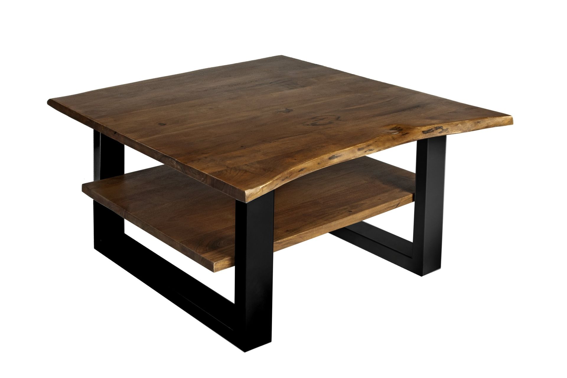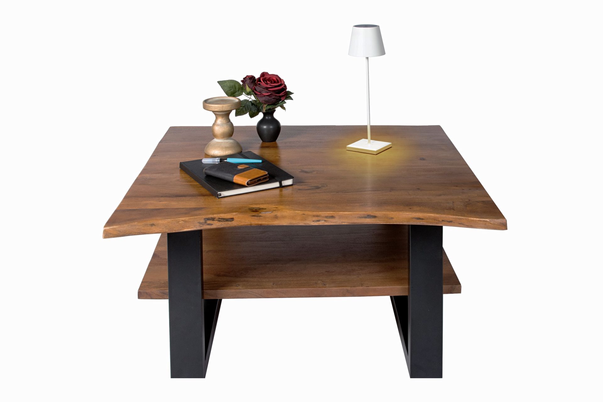 Praktischer Couchtisch Patrick mit Ablage, 90 x 90 cm, Akazienholz massiv + nussbaumfarben, schwarz lackiertes U-Metallgestell, echte Baumkante