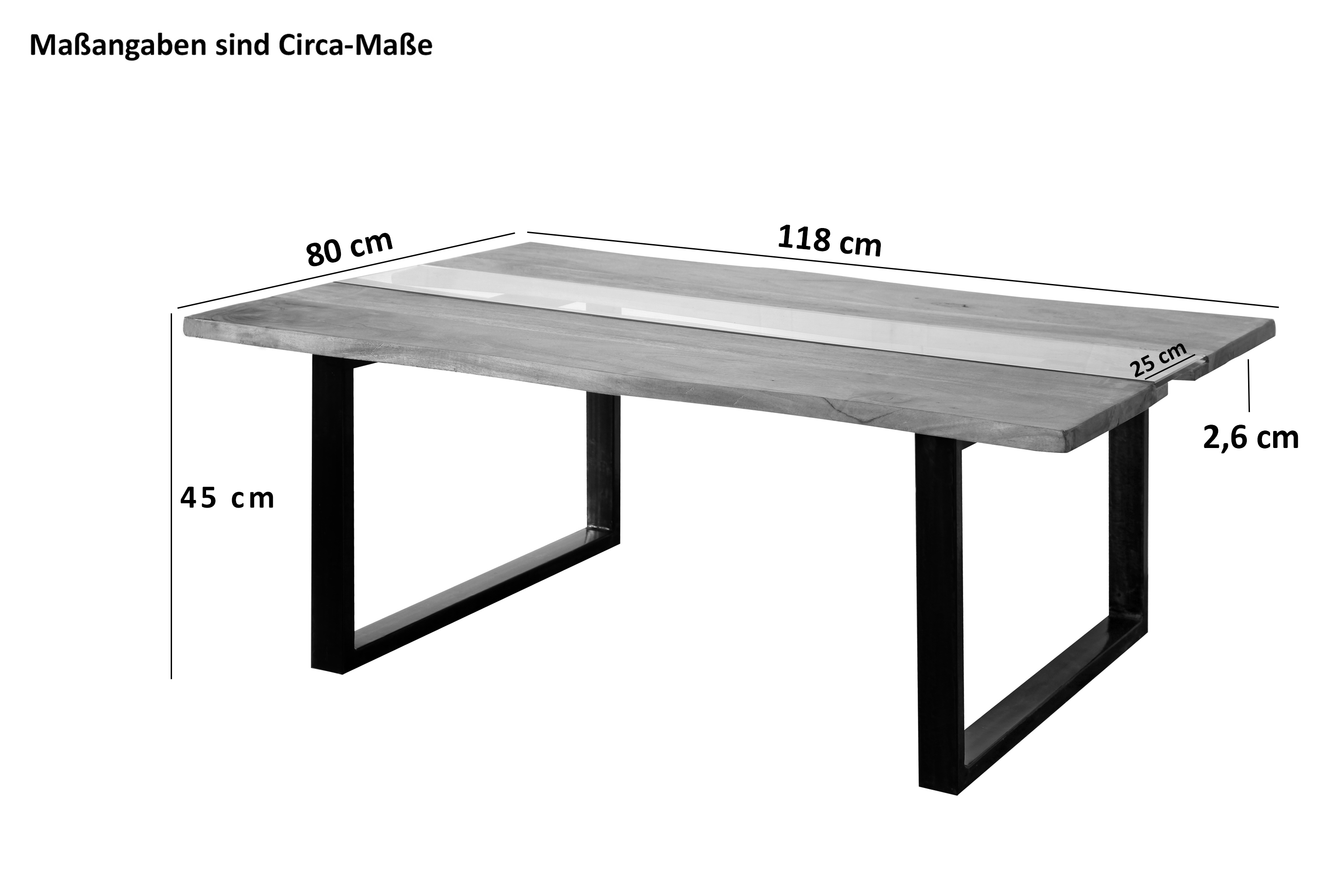 Produktinformationen "Couchtisch Baumkante mit Glaseinsatz 118 x 80 cm Akazie massiv stonefarben U-Gestell schwarz Frank"
