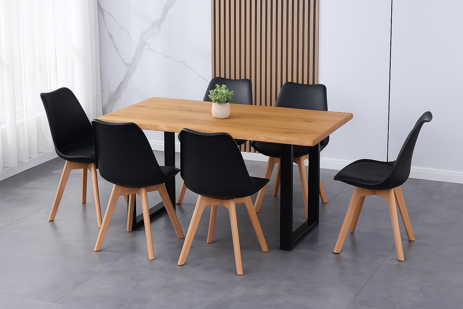 Tauchen Sie ein in die wohnliche Harmonie unserer Tischgruppe Josy – eine Einladung zum Genießen, Ankommen und Wohlfühlen. Die elegante Tischplatte in Wildeiche-Optik mit sanft geschwungener Baumkante bringt Wärme und Natürlichkeit in Ihr Esszimmer, während das schwarze U-Gestell moderne Akzente setzt. Die stilvollen Schalenstühle mit bequemer Polsterung vervollständigen das Set zu einem charmanten Ensemble voller Charakter – perfekt für gemütliche Abende und gesellige Mahlzeiten mit Ihren Liebsten.