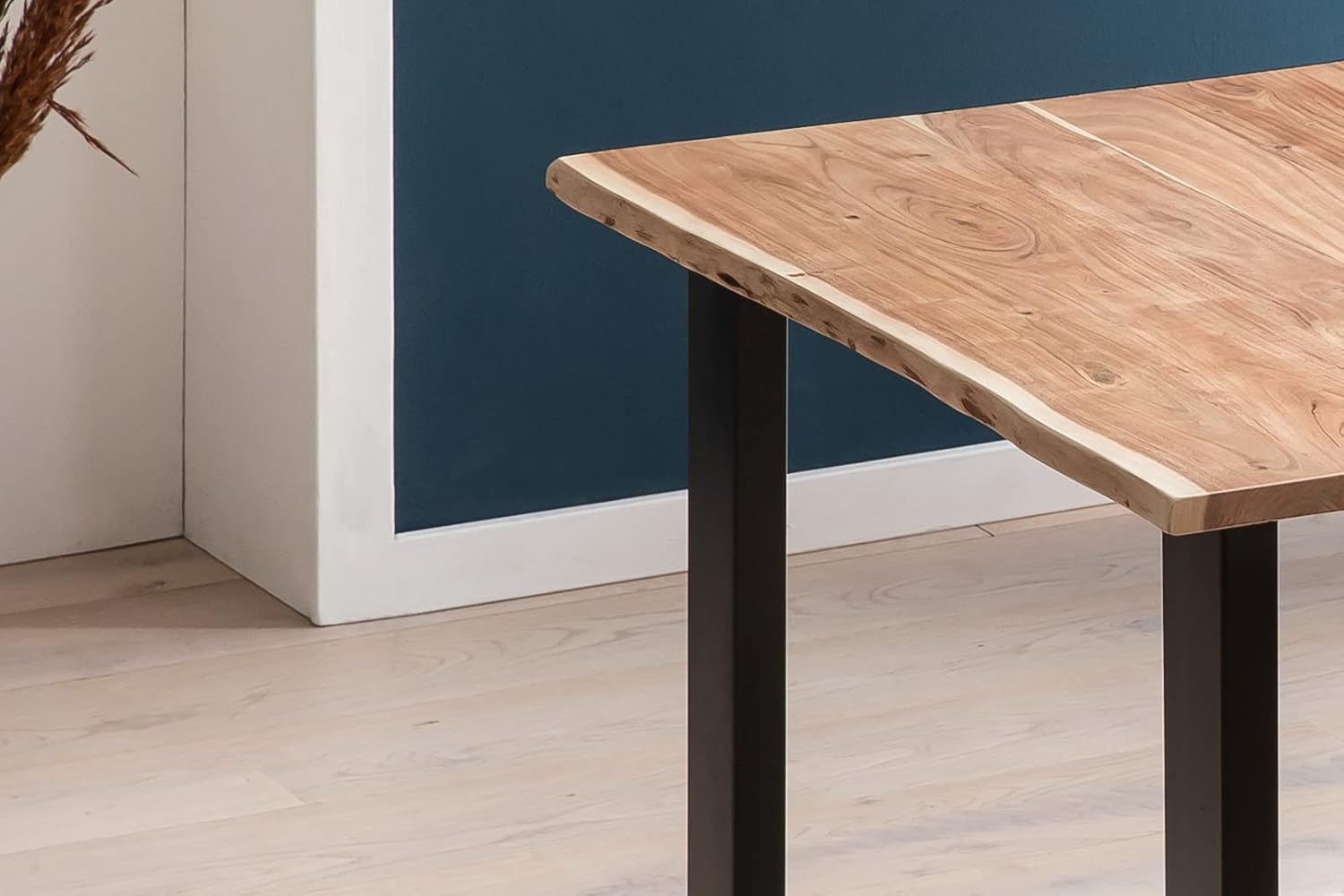 Die 26 mm starke Tischplatte aus hochwertigem Akazienholz in naturfarben begeistert mit einer ausdrucksstarken Maserung, die den natürlichen Charme des Holzes sanft betont. Das robuste Hartholz sorgt nicht nur für außergewöhnliche Stabilität, sondern auch für ein warmes Wohngefühl, das Behaglichkeit ausstrahlt – perfekt für Ihr Esszimmer.