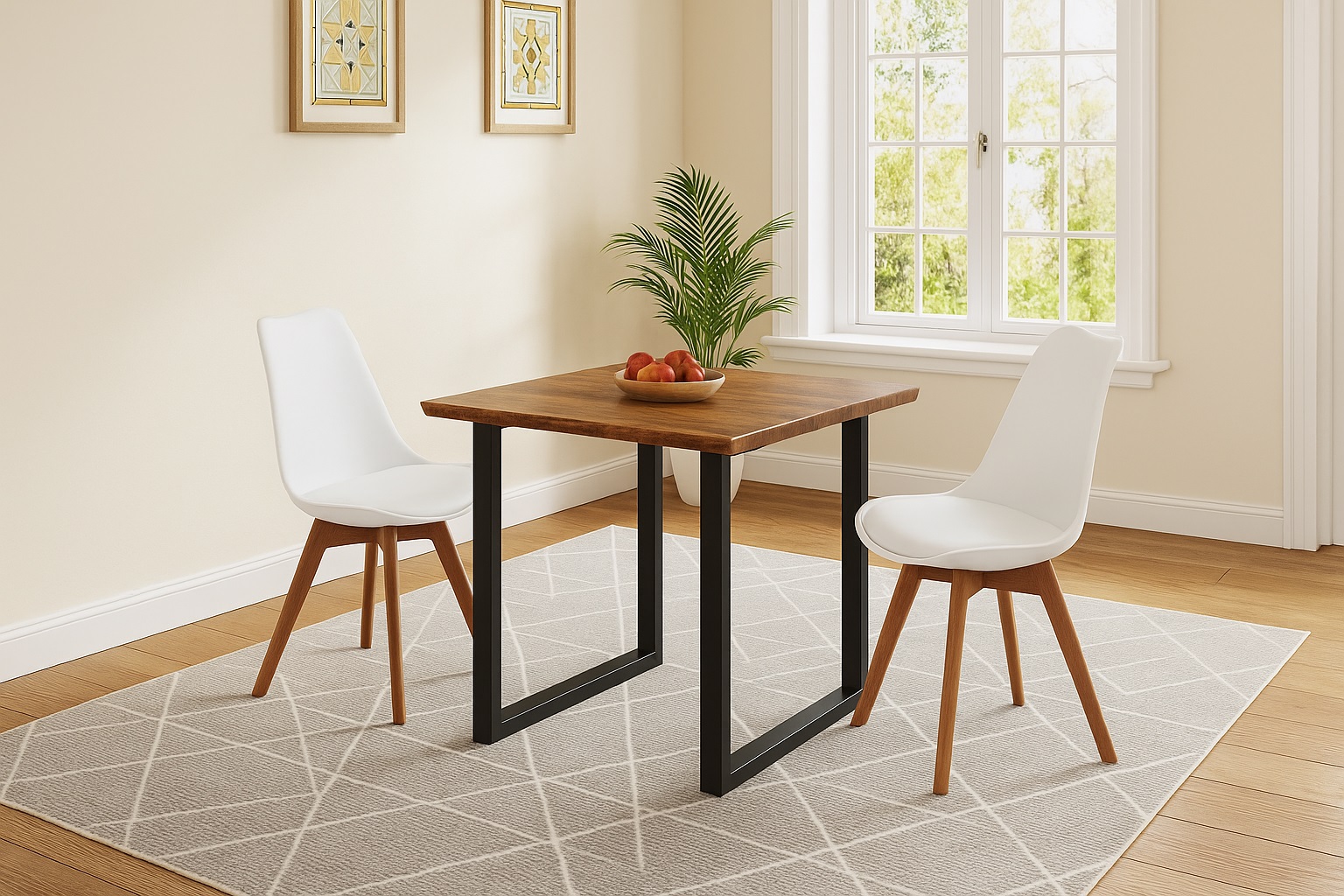 3 tlg. Essgruppe Quinn – 90 x 90 cm, Akazienholz massiv + nussbaumfarben, Echte Baumkante, U-Gestell Schwarz, inkl. 2 Schalenstühle in Weiß
