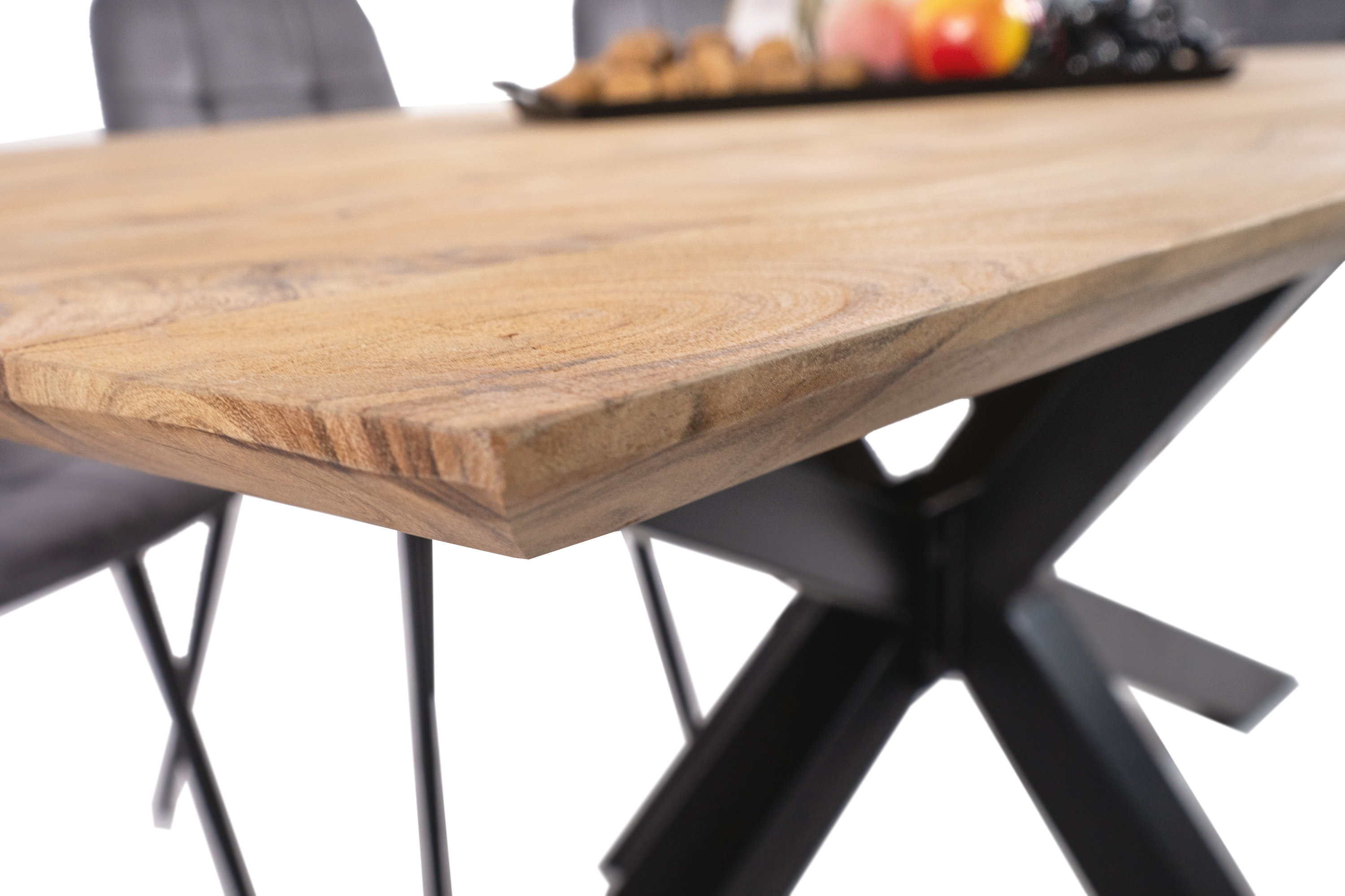 Stilvolle Kombination – Die markante Naturholzplatte mit Schweizer Kante harmoniert ideal mit dem Metallgestell in Spider-Form. Der besondere Stil verleiht jedem Wohn- oder Esszimmer ein Gefühl von Wärme und Gemütlichkeit.