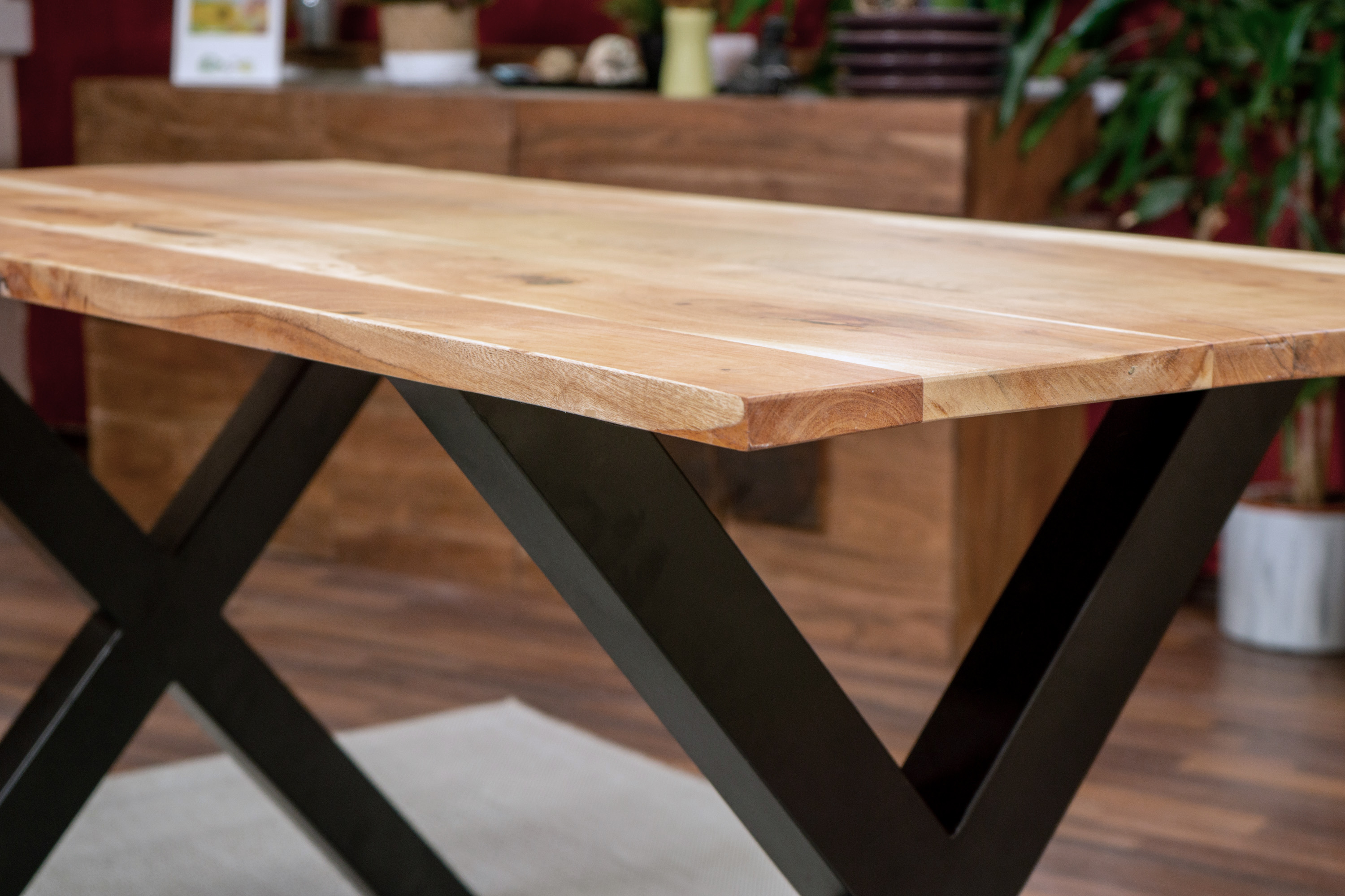 Exklusives Design - Die Kombination aus Akazienholz und schlichtem X-Gestell aus Metall kreiert einen zeitlosen Look, der sehr gut zu allen Möbeln passt. Der stilvolle Massivholztisch fügt sich perfekt in moderne Einrichtungen sowie dem beliebtem Industrial Design ein.