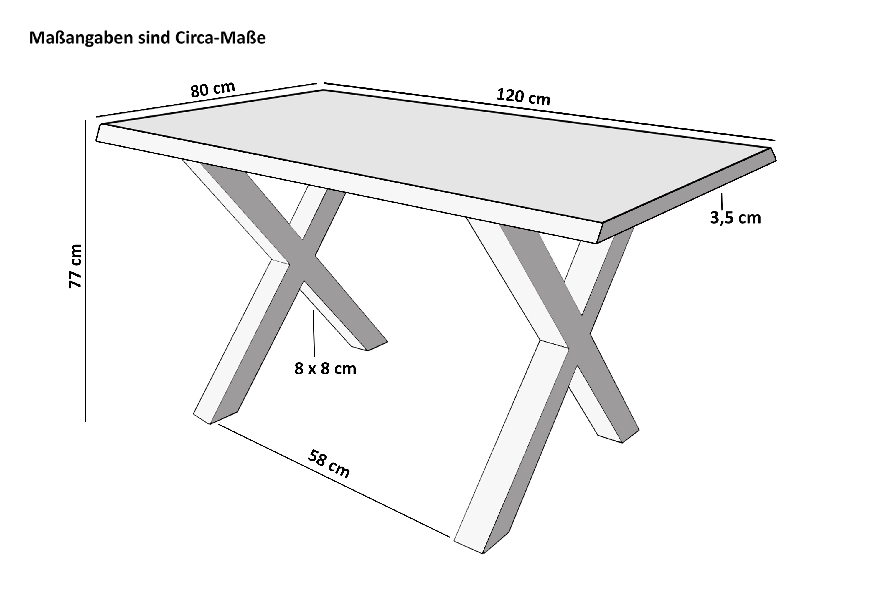 Esszimmertisch Frederik mit X-Gestell aus Metall, 120 x 80 cm, Akazienholz nussbaumfarben, echte Baumkante, Tischplatte 26 mm