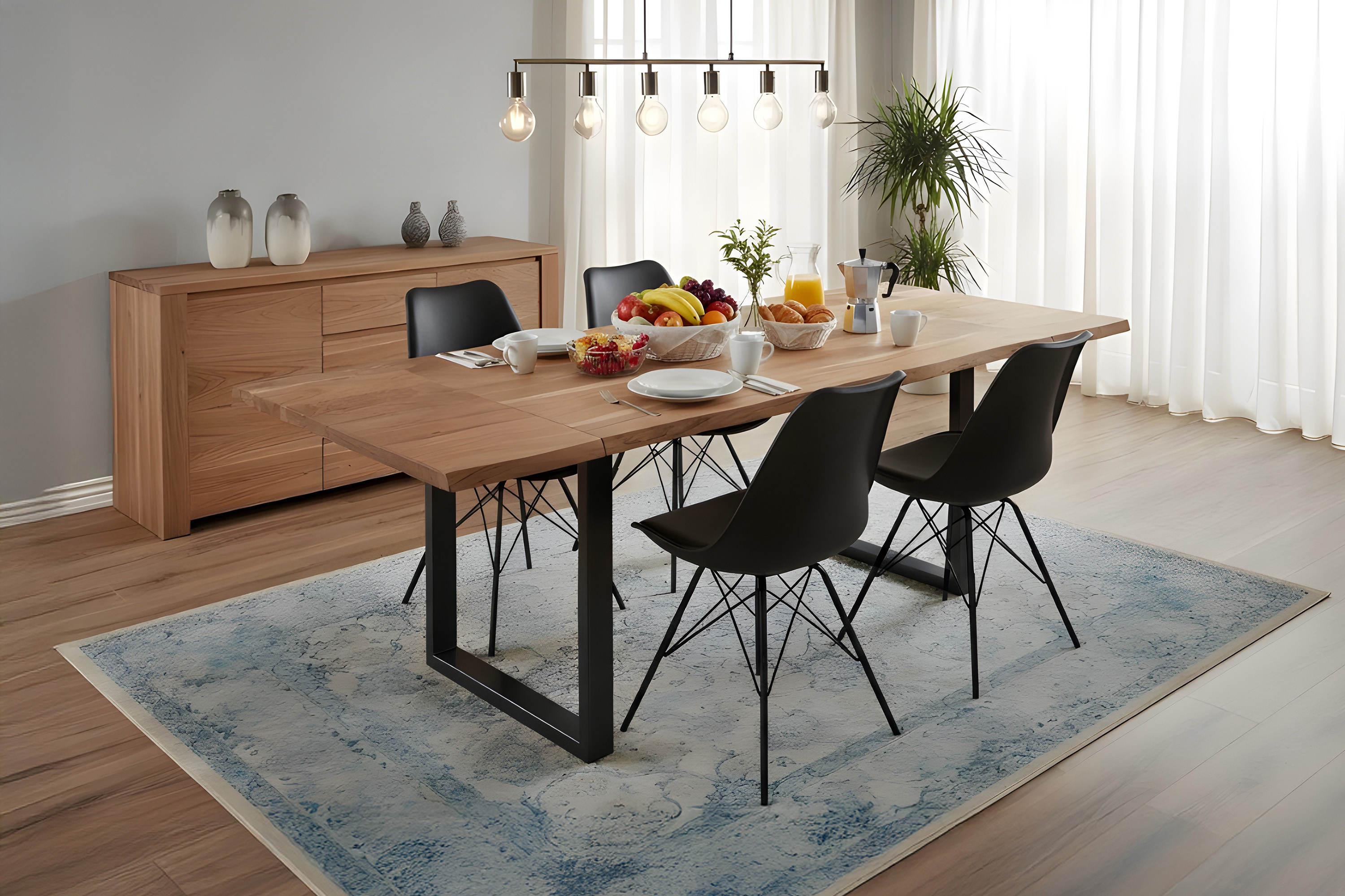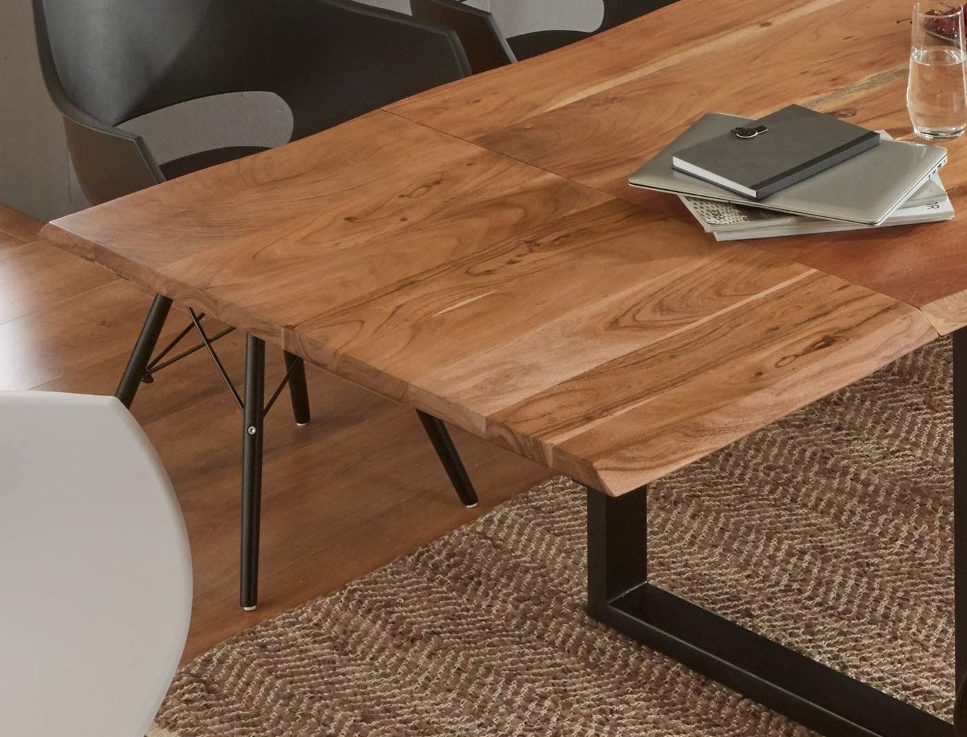 Hochwertiger Esszimmertisch Adina 120 (200) x 90 cm, Tischplatte 26 mm, mit 2 Ansteckplatten, Akazienholz massiv & naturfarben, echte Baumkante, schwarzes U-Metallgestell