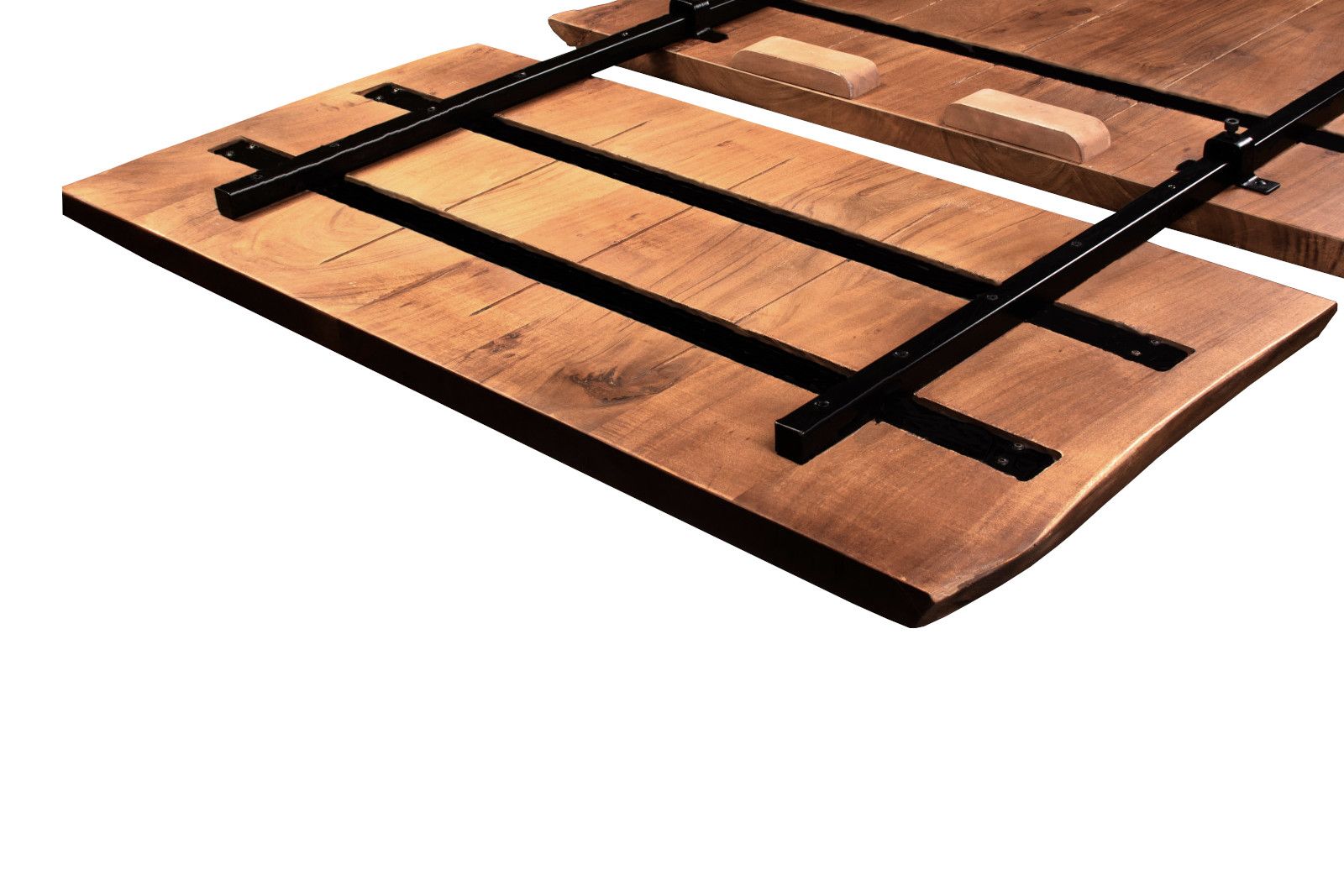 Hochwertiger Esszimmertisch Adina 200 (300) x 100 cm, Tischplatte 26 mm, mit 2 Ansteckplatten, Akazienholz massiv & naturfarben, echte Baumkante, schwarzes U-Metallgestell