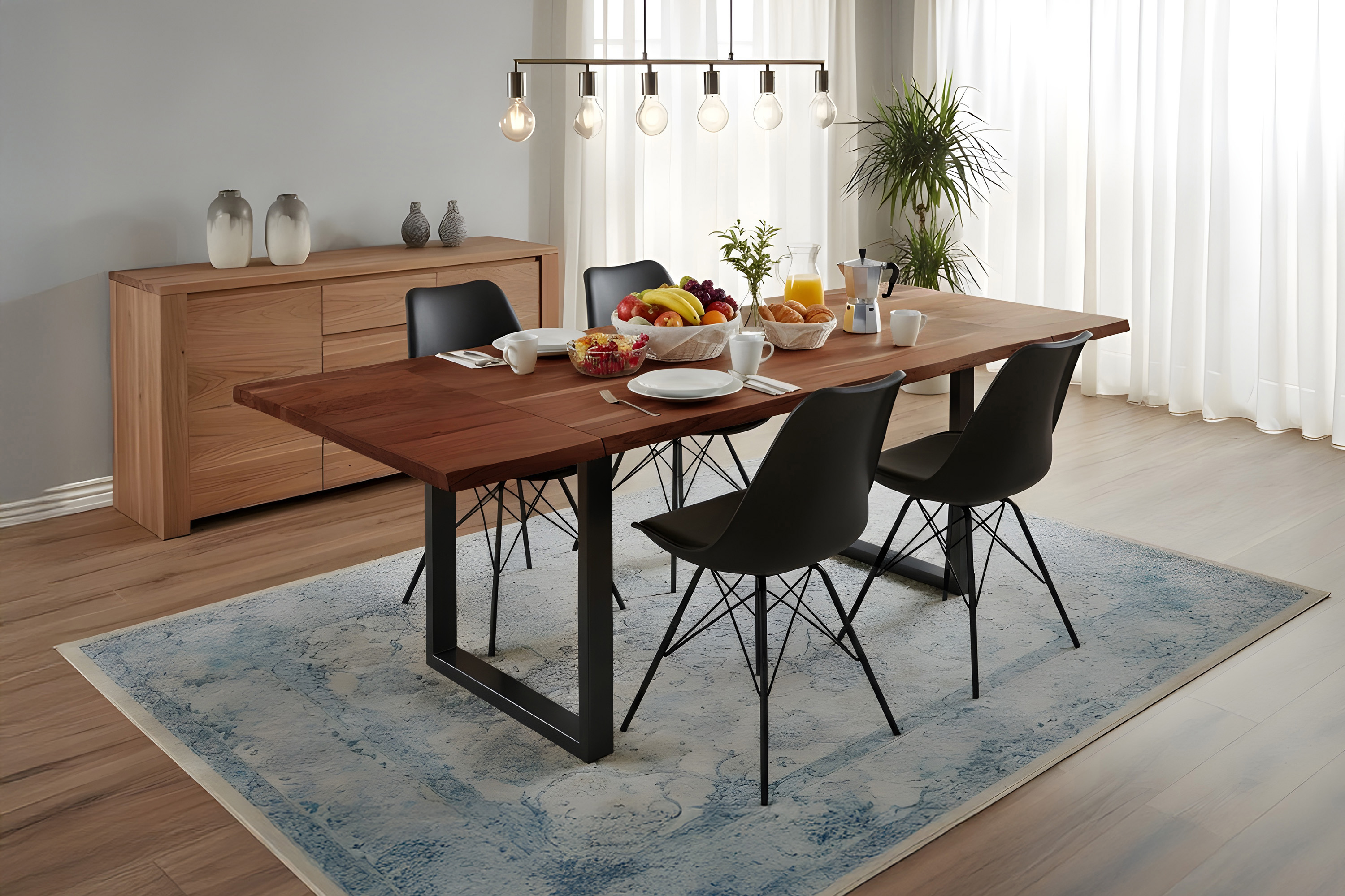 Hochwertiger Esszimmertisch Adina 220 (320) x 100 cm, Tischplatte 26 mm, mit 2 Ansteckplatten, Akazienholz massiv & nussbaumfarben, echte Baumkante, schwarzes U-Metallgestell