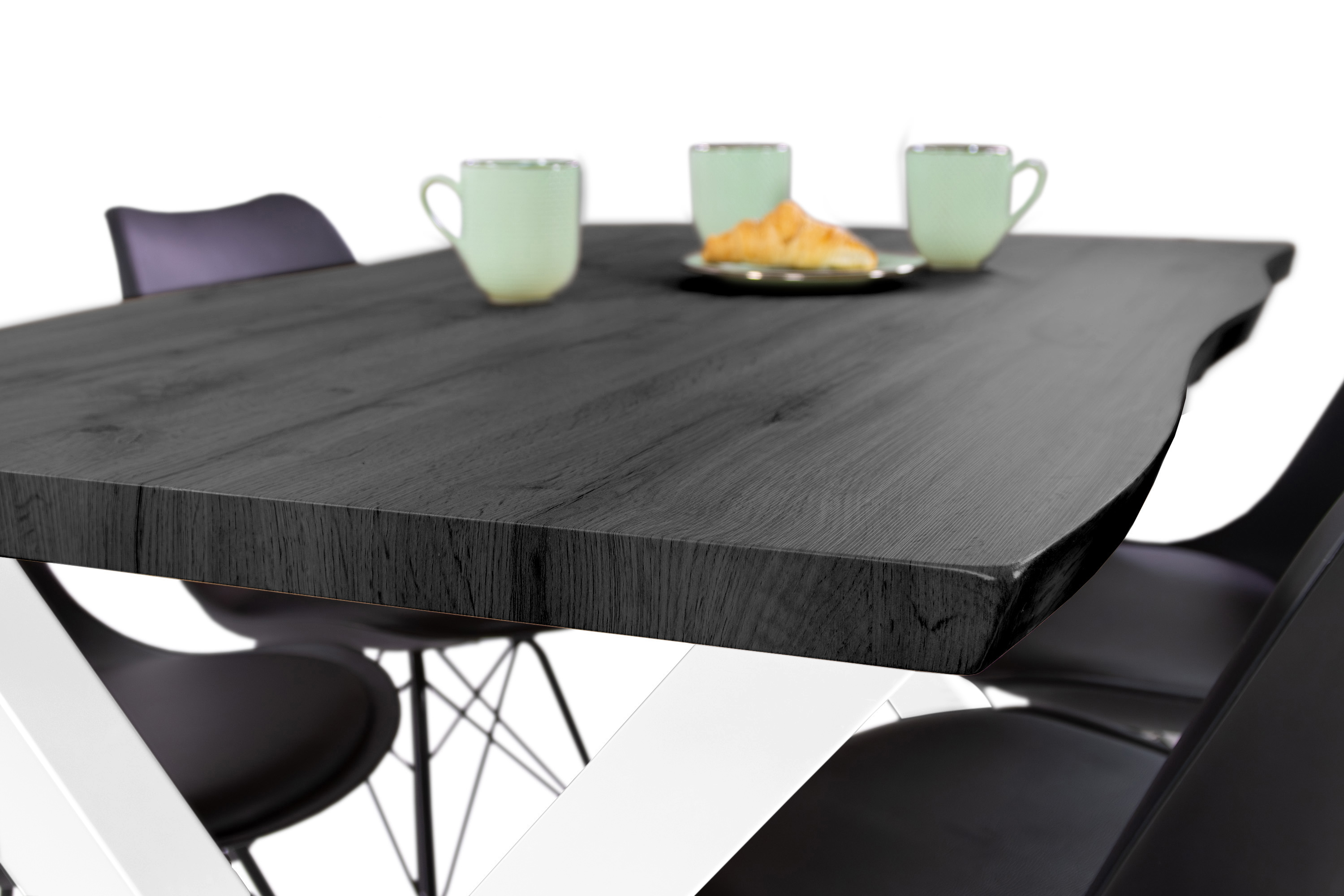 Der Esstisch verbindet Stil und Funktionalität in einem hochwertigen Design. Die 40 mm starke Tischplatte aus MDF in grauer Holz-Optik bringt durch ihre gefräste Baumkante eine elegante und edle Ausstrahlung in jeden Wohnbereich. Das lackierte X-Gestell bietet Stabilität und betont das moderne Design des Tisches.