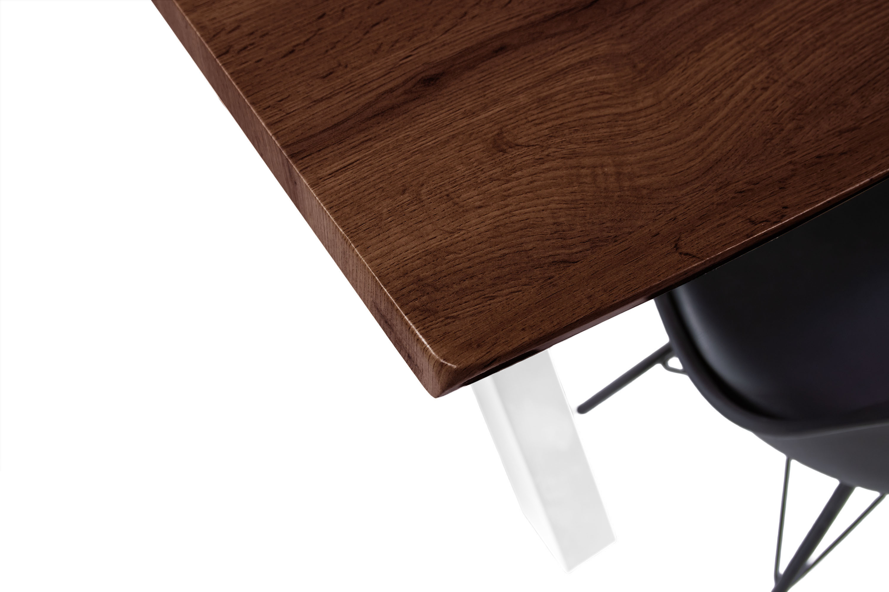 Esstisch Josy, Holz Nussbaum-Optik, X-Gestell Metall weiß, 160 x 85 cm, 40 mm Tischplatte mit gefräster Baumkante