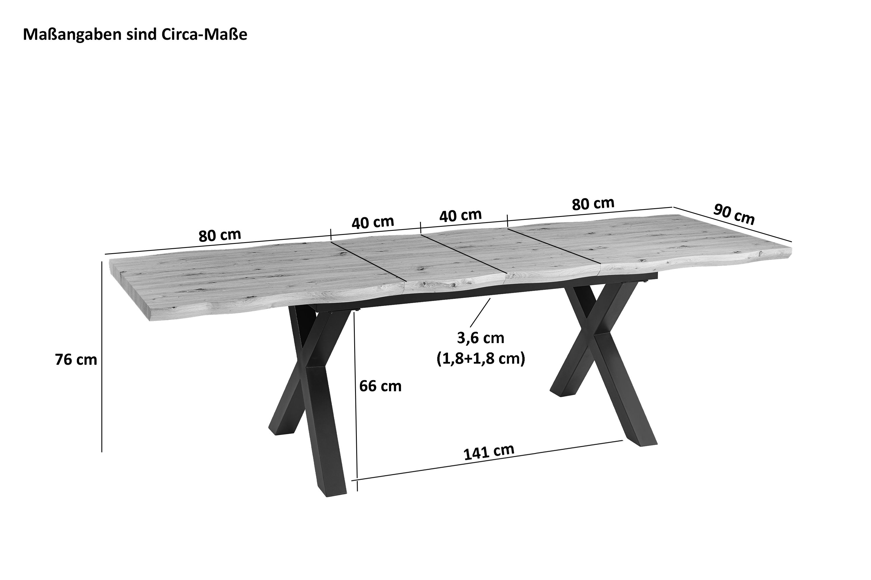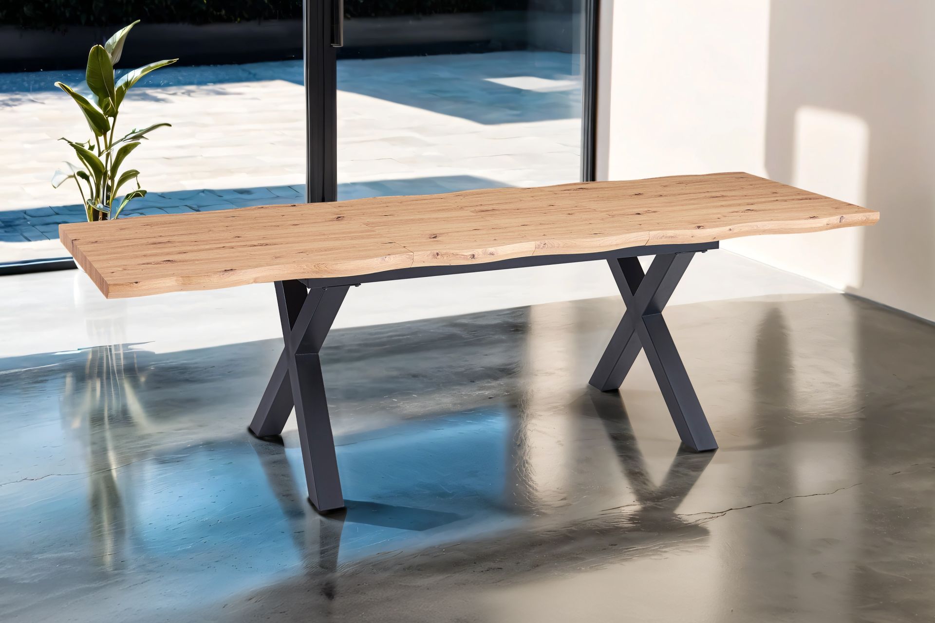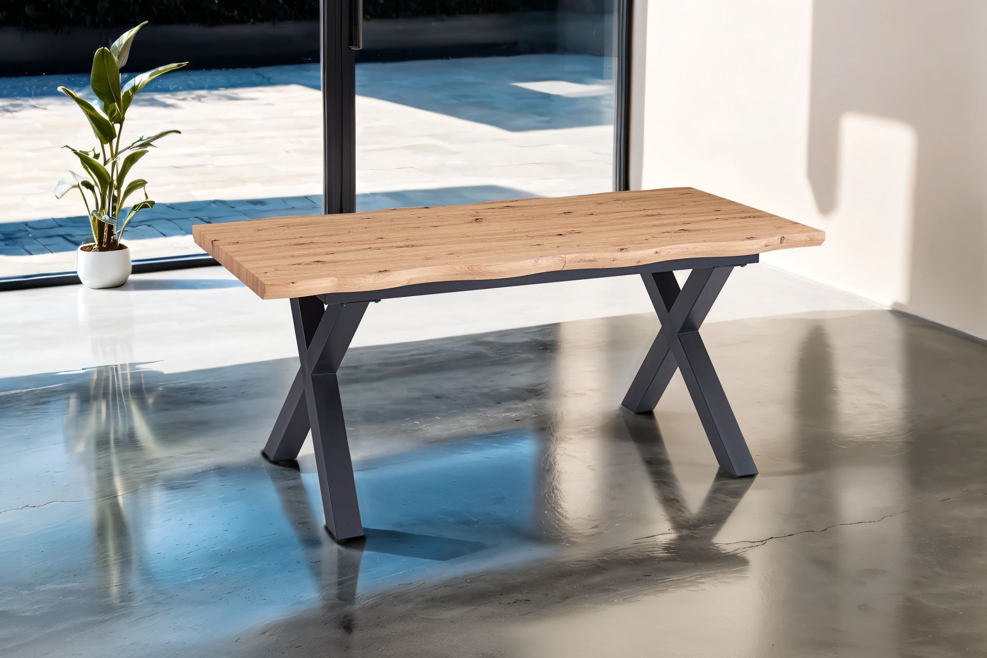 Weiterführende Links zu "Esstisch Baumkante Holz Wildeiche-Optik 160(240) x 90 X-Gestell schwarz SWAN"