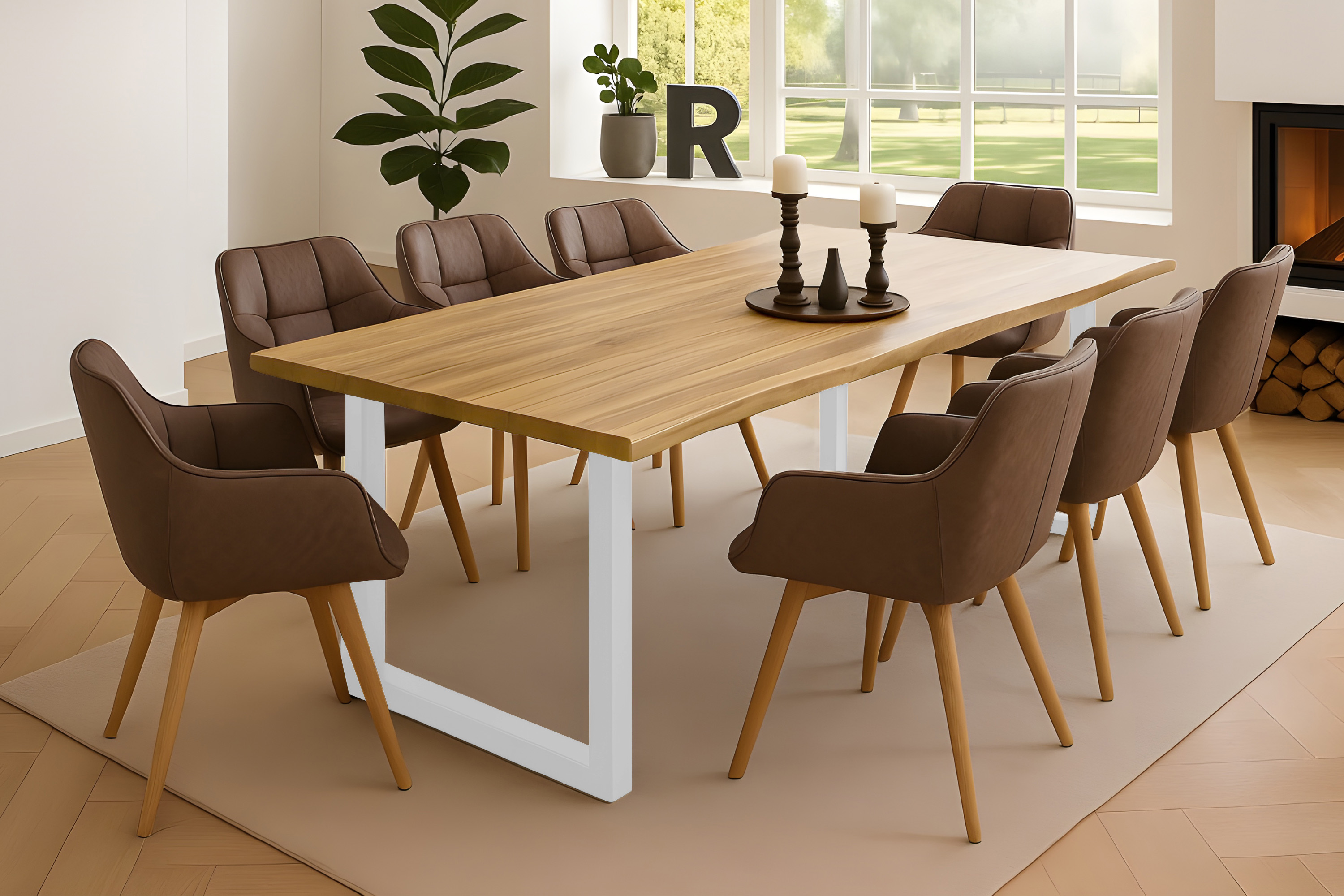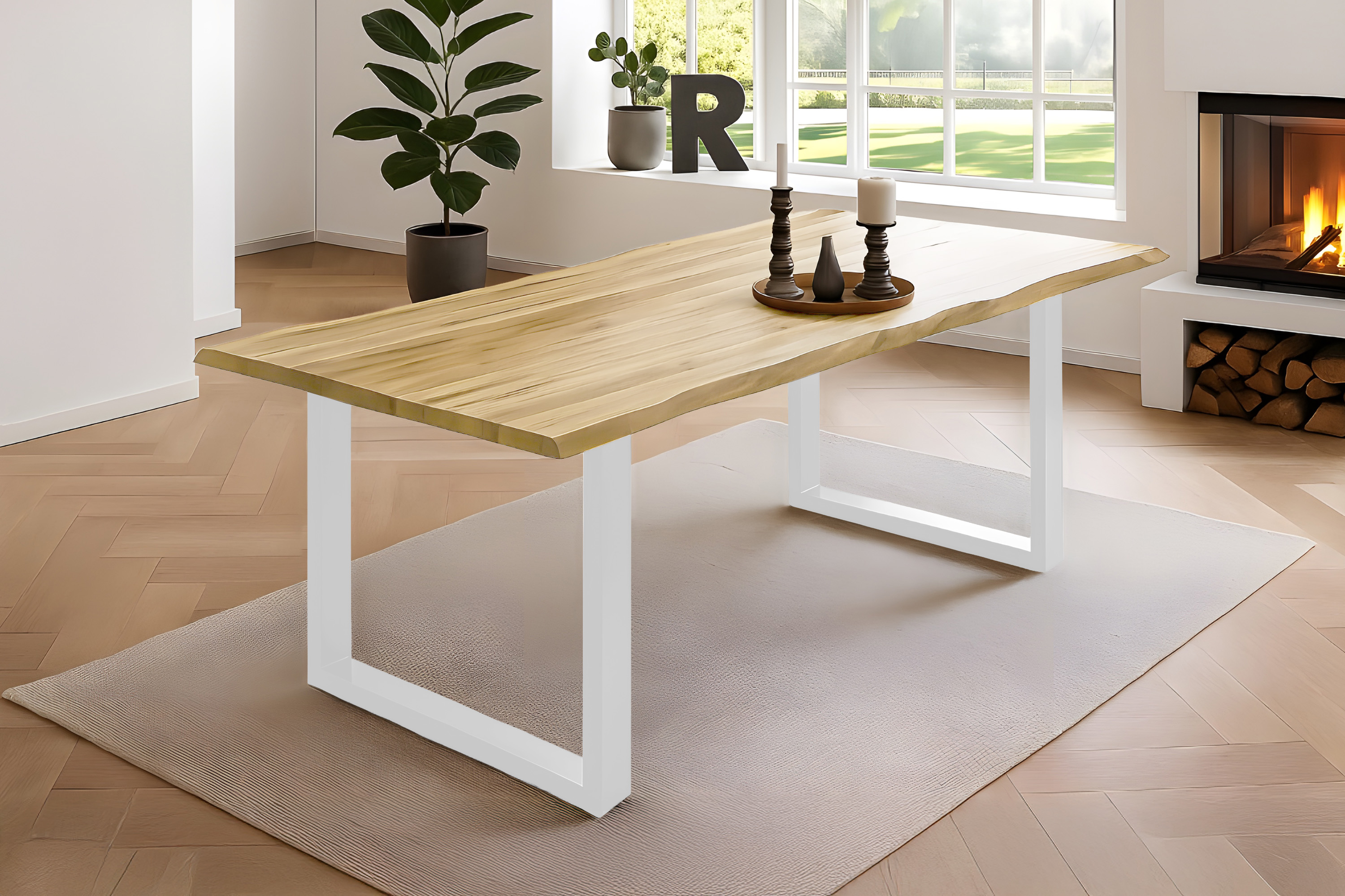 Esszimmertisch Noah, Baumkantentisch 300 x 100 cm, Massivholz Akazie / Eichefarben, Gestell Weiß