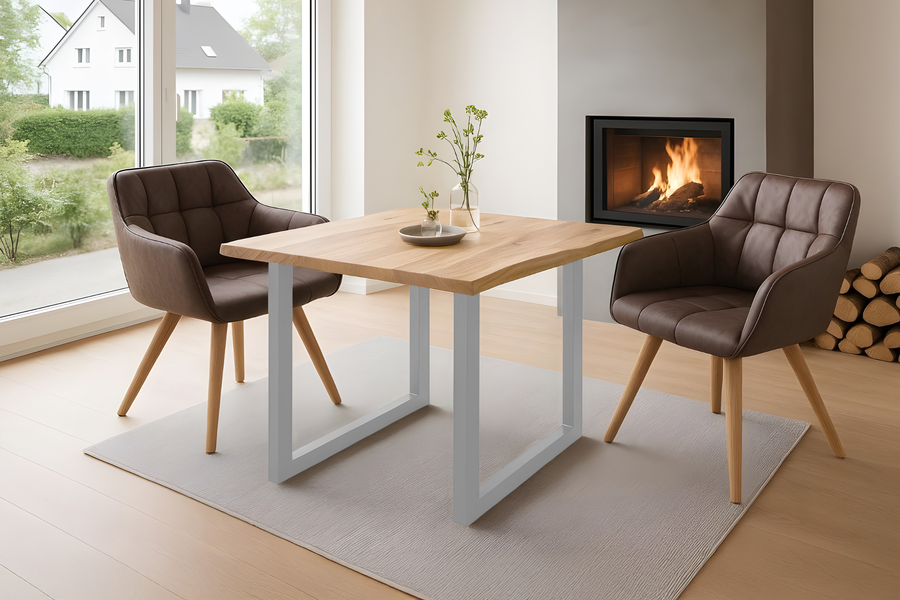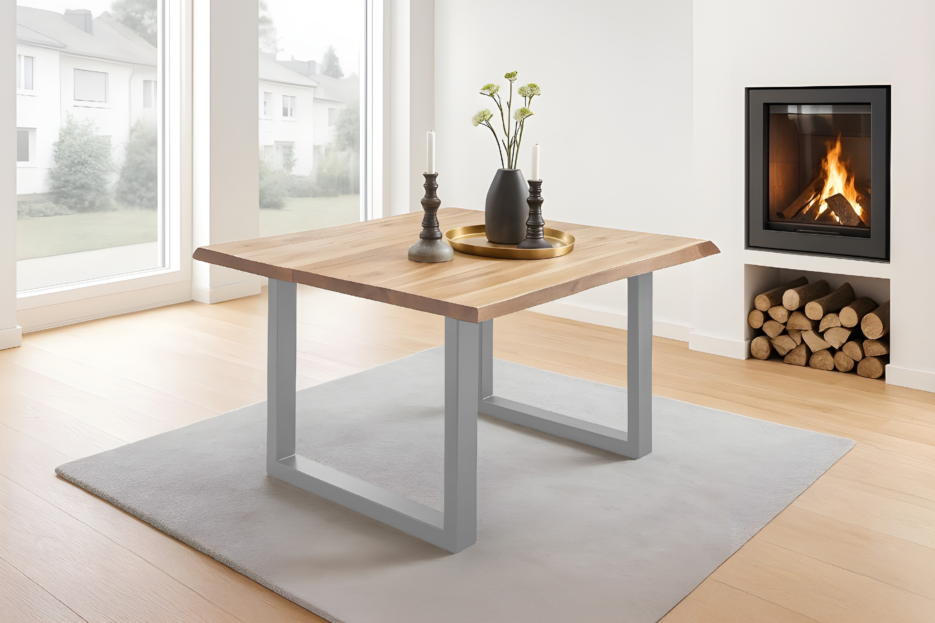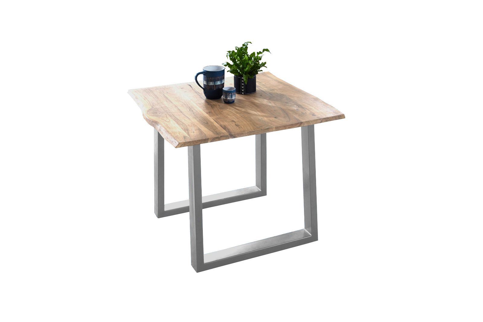 Esszimmertisch Noah, Baumkantentisch 80 x 80 cm, Massivholz Akazie / Eichefarben, Gestell Silber