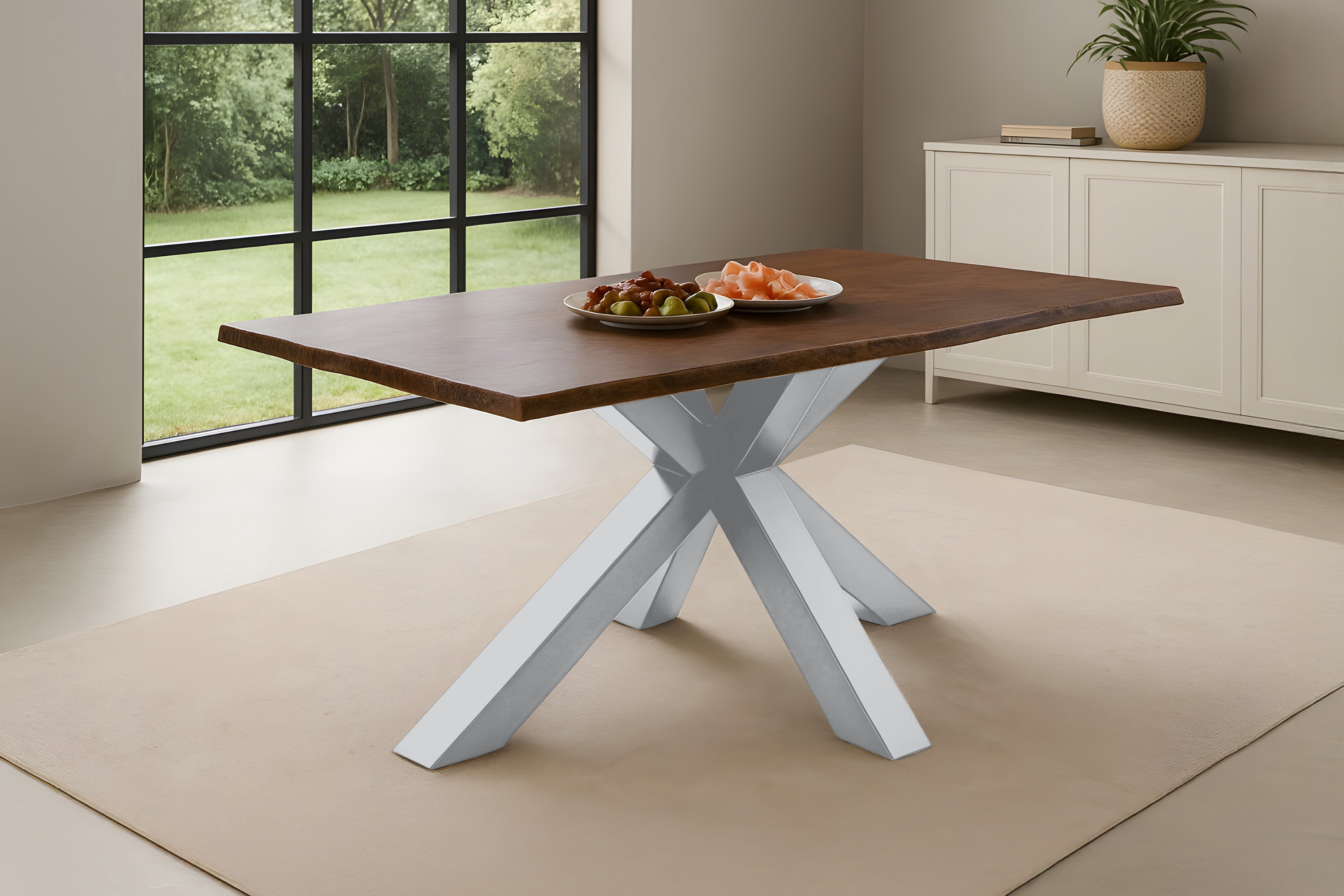 Verleihen Sie Ihrem Esszimmer eine ganz besondere Atmosphäre – mit Roxana, dem Massivholztisch, der Naturverbundenheit und modernes Design auf unvergleichliche Weise vereint. Die kastanienfarbene Tischplatte aus echtem Akazienholz bringt Wärme und Geborgenheit in Ihr Zuhause, während die organisch verlaufende Baumkante jedes Stück zu einem einzigartigen Kunstwerk der Natur macht. Gekrönt wird das Design durch das stabile, silbere Spider-Gestell – ein stilvoller Kontrast, der Roxana zu einem echten Highlight macht.