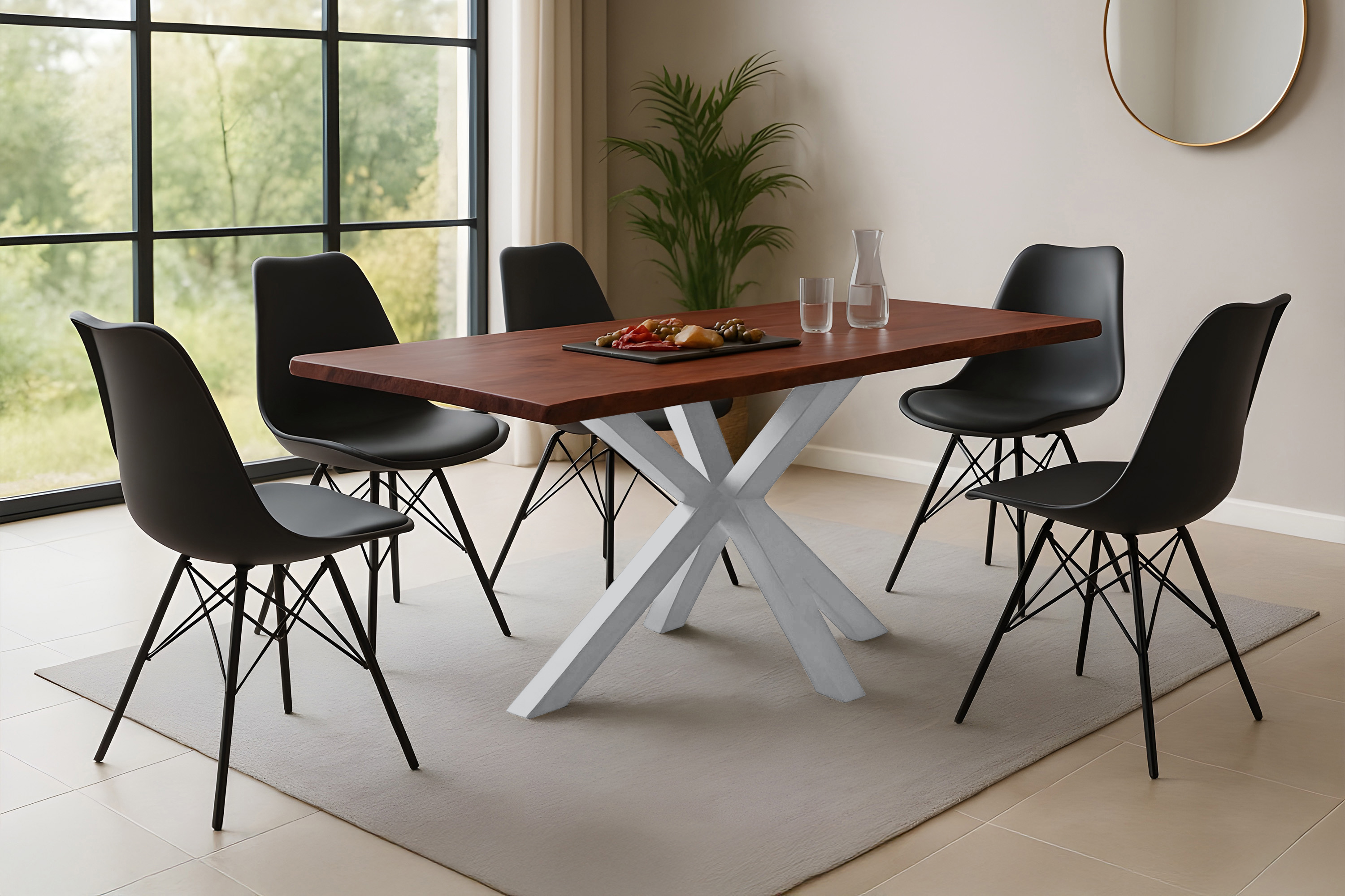 Verleihen Sie Ihrem Esszimmer eine ganz besondere Atmosphäre – mit Roxana, dem Massivholztisch, der Naturverbundenheit und modernes Design auf unvergleichliche Weise vereint. Die kastanienfarbene Tischplatte aus echtem Akazienholz bringt Wärme und Geborgenheit in Ihr Zuhause, während die organisch verlaufende Baumkante jedes Stück zu einem einzigartigen Kunstwerk der Natur macht. Gekrönt wird das Design durch das stabile, silbere Spider-Gestell – ein stilvoller Kontrast, der Roxana zu einem echten Highlight macht.