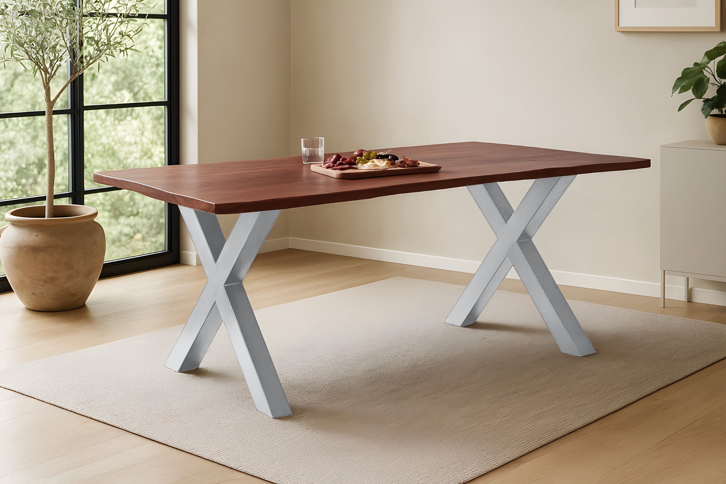 Esstisch Roxana, 180 x 90 cm, Akazienholz massiv + kastanienfarben, X-Gestell silber, Echte Baumkante