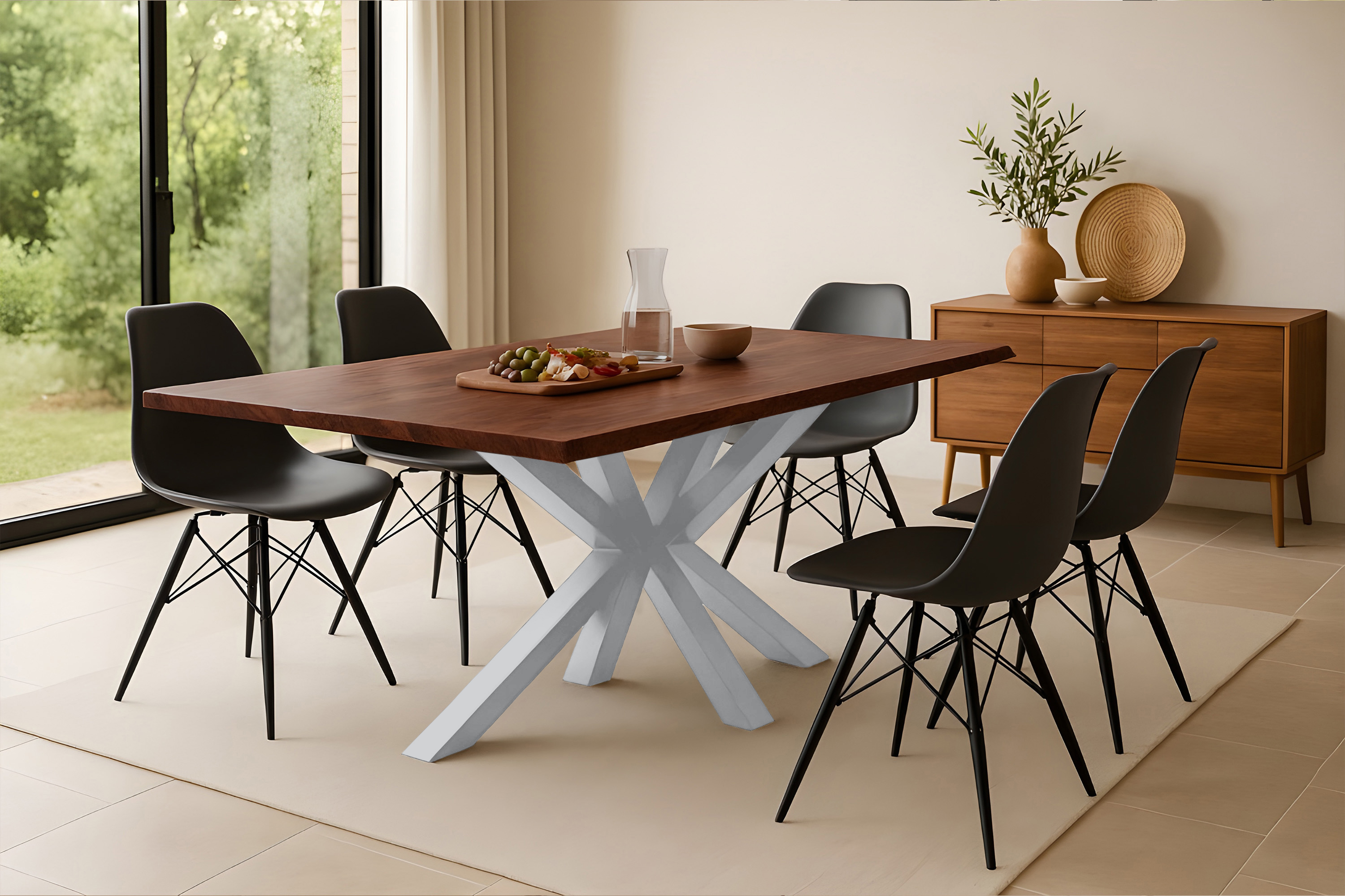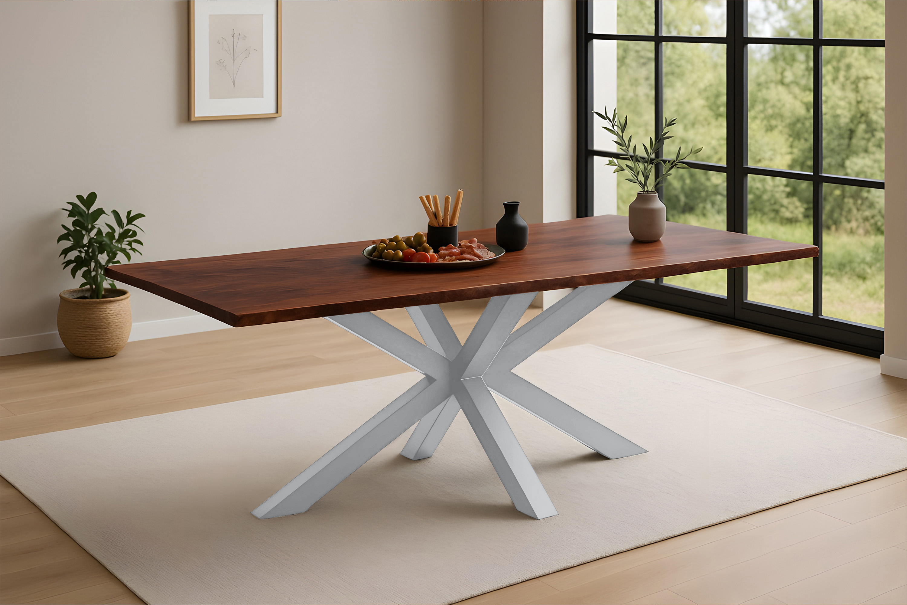 Verleihen Sie Ihrem Esszimmer eine ganz besondere Atmosphäre – mit Roxana, dem Massivholztisch, der Naturverbundenheit und modernes Design auf unvergleichliche Weise vereint. Die kastanienfarbene Tischplatte aus echtem Akazienholz bringt Wärme und Geborgenheit in Ihr Zuhause, während die organisch verlaufende Baumkante jedes Stück zu einem einzigartigen Kunstwerk der Natur macht. Gekrönt wird das Design durch das stabile, silbere Spider-Gestell – ein stilvoller Kontrast, der Roxana zu einem echten Highlight macht.