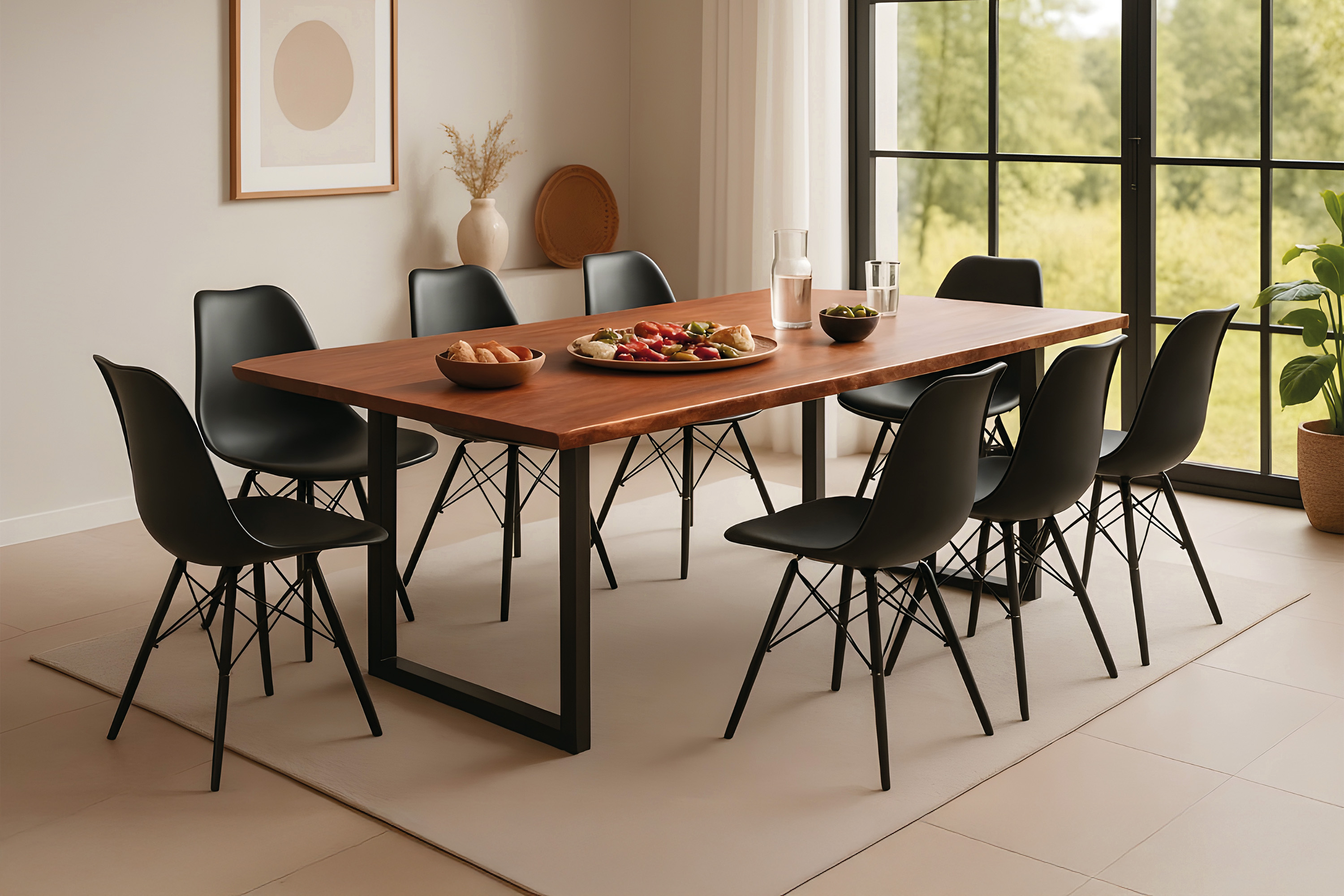 Verleihen Sie Ihrem Esszimmer eine ganz besondere Atmosphäre – mit Roxana, dem Massivholztisch, der Naturverbundenheit und modernes Design auf unvergleichliche Weise vereint. Die kastanienfarbene Tischplatte aus echtem Akazienholz bringt Wärme und Geborgenheit in Ihr Zuhause, während die organisch verlaufende Baumkante jedes Stück zu einem einzigartigen Kunstwerk der Natur macht. Gekrönt wird das Design durch das stabile, schwarze U-Gestell – ein stilvoller Kontrast, der Roxana zu einem echten Highlight macht.