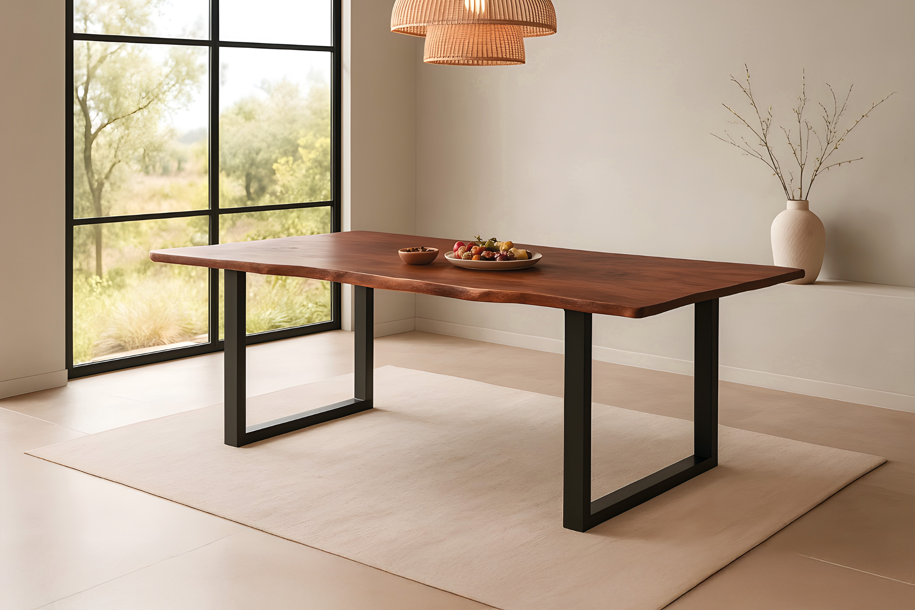 Das robuste U-Gestell aus schwarzem Metall bringt Ruhe und Modernität in die Formgebung. Es unterstreicht den natürlichen Charakter der Tischplatte und sorgt gleichzeitig für hohe Standfestigkeit. Integrierte Bodenschoner schützen empfindliche Böden und gleichen kleine Unebenheiten sanft aus.