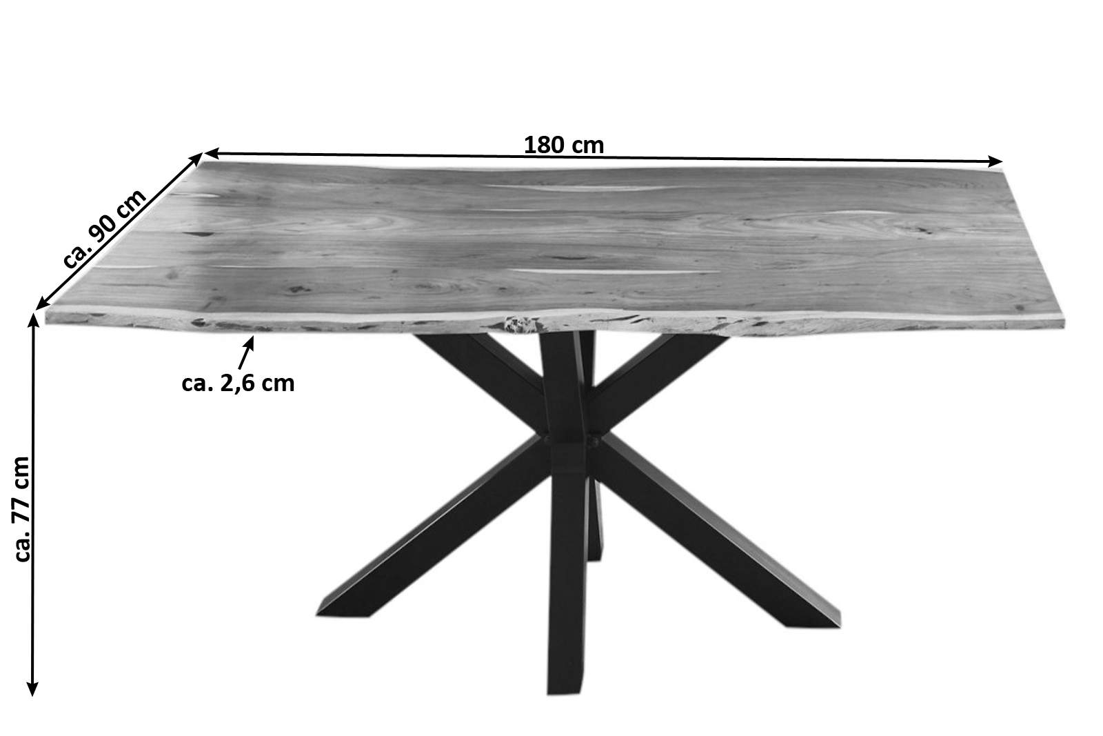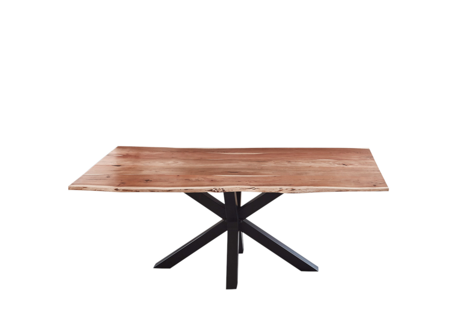 Trendiger Esszimmertisch Quincy mit mattschwarzem Spider-Gestell aus Roheisen, 180 x 90 cm, Akazienholz naturfarben, echte Baumkante, Tischplatte 26 mm