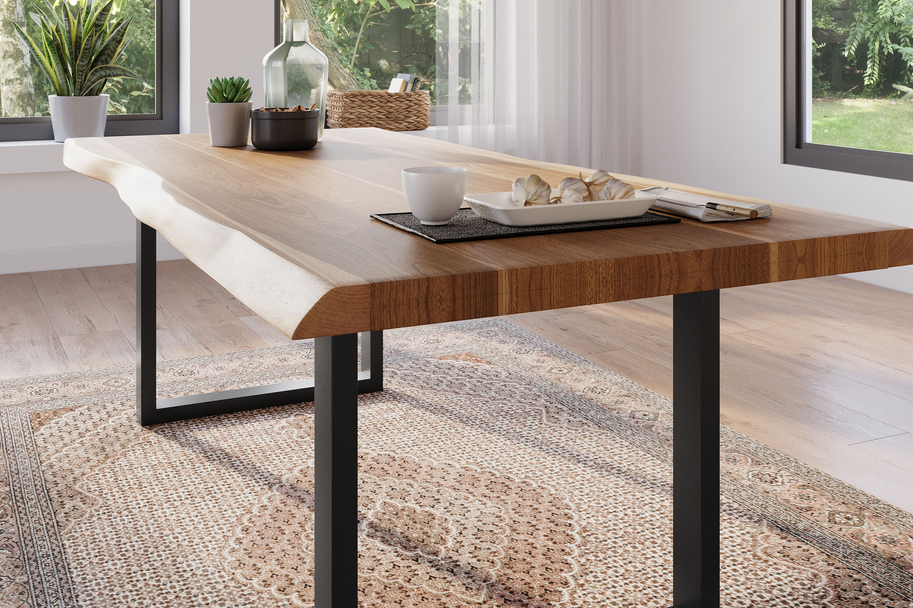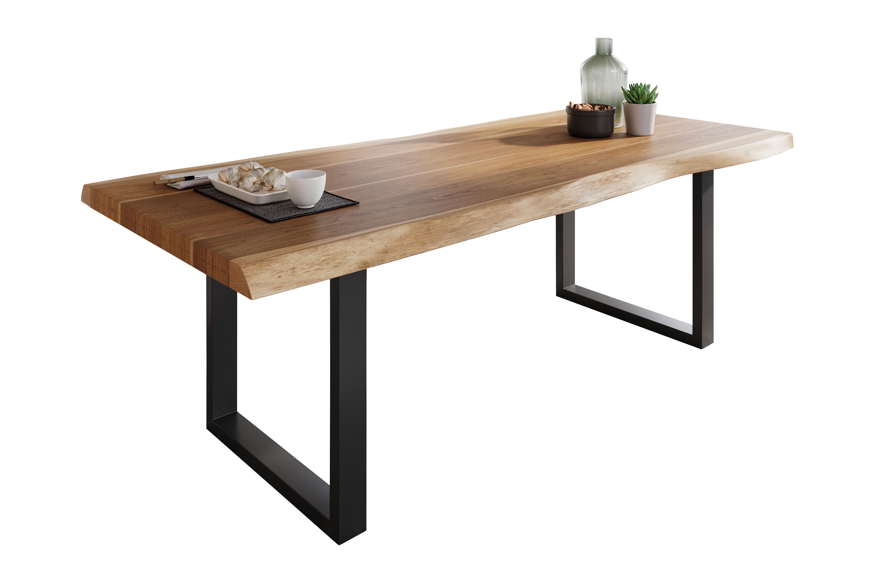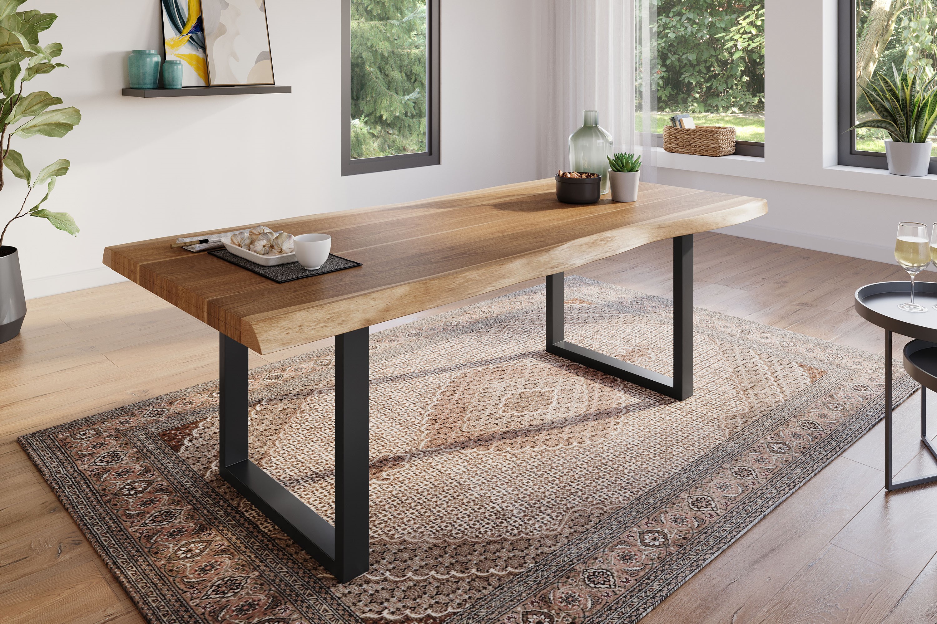 Esszimmertisch Atlas, 200 x 100 cm, massives Akazienholz naturfarben, echte Baumkante, U-Gestell aus Metall Schwarz