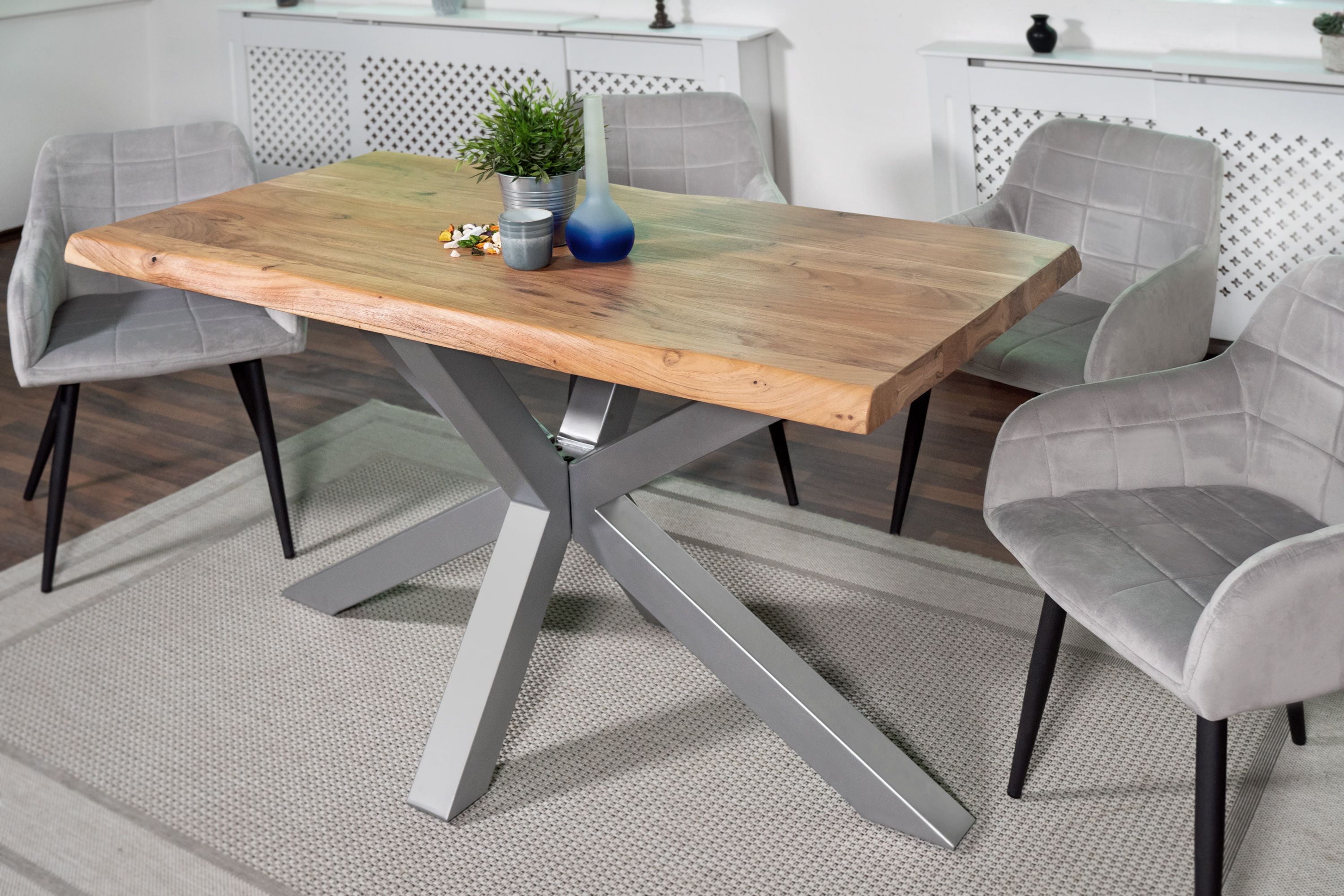 Trendiger Esszimmertisch Cali, 220 x 110 cm, Akazienholz massiv & naturfarben, Tischplatte (25 + 25 mm), Spider-Gestell Silber