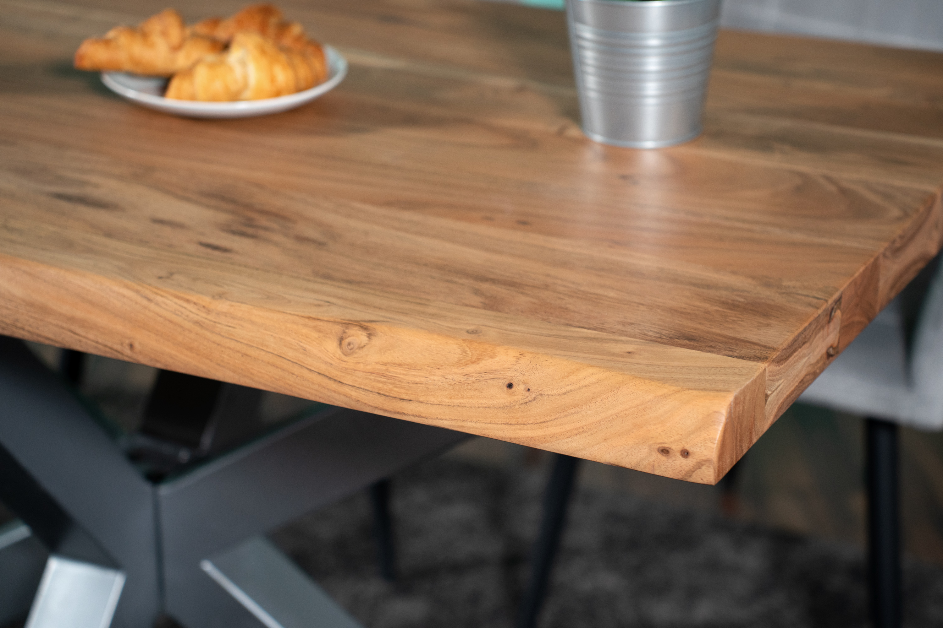 Natur Pur – Besonderes Highlight des Esszimmertisches sind die Tischkanten, die den natürlichen Formen eines Baumes entsprechen und direkt aus dem Baumstamm geschnitten wurden. Da der Tisch ein reines Naturprodukt ist, kann es zu Astlöchern oder unterschiedlichen Farbnuancen kommen.