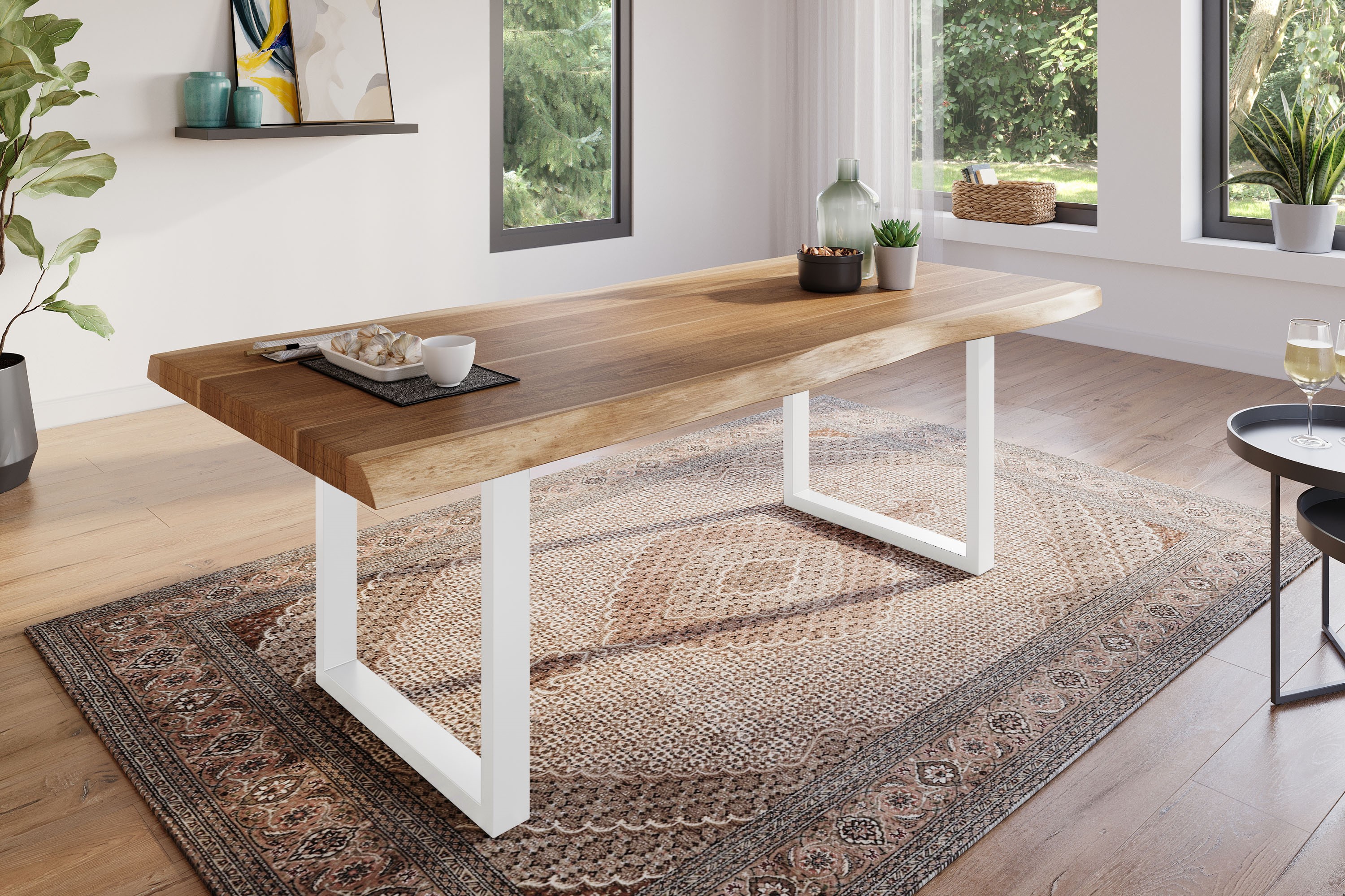 Esszimmertisch Atlas, 220 x 110 cm, massives Akazienholz naturfarben, echte Baumkante, U-Gestell aus Metall Weiß