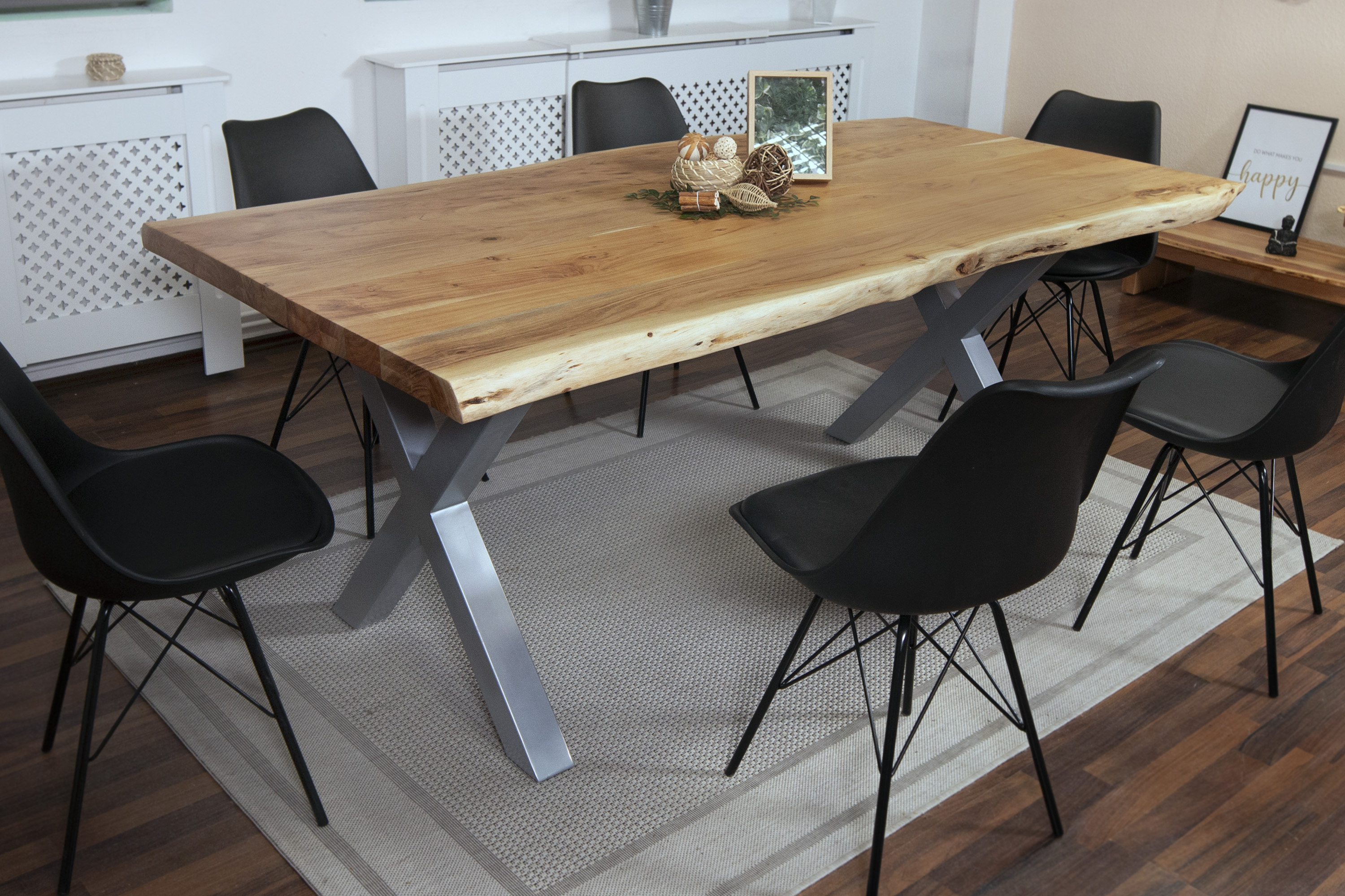 Weiterführende Links zu "Esstisch Baumkante massiv Akazie Natur 260 x 120 X-Gestell silber CALI"