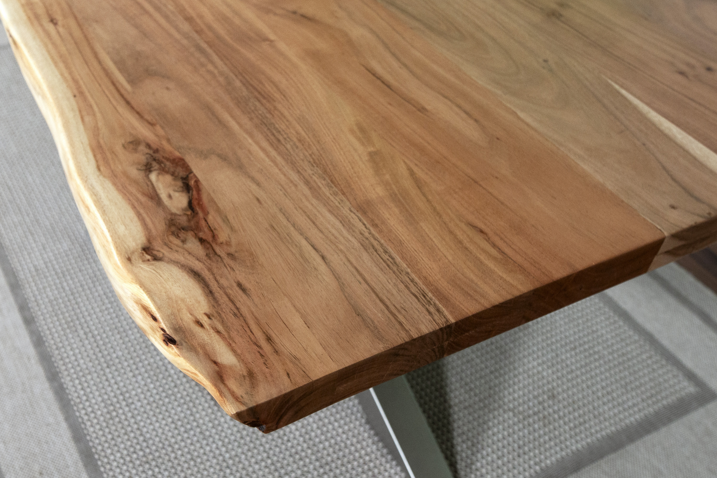 Weiterführende Links zu "Esstisch Baumkante massiv Akazie Natur 300 x 110 Spider-Gestell silber CALI"