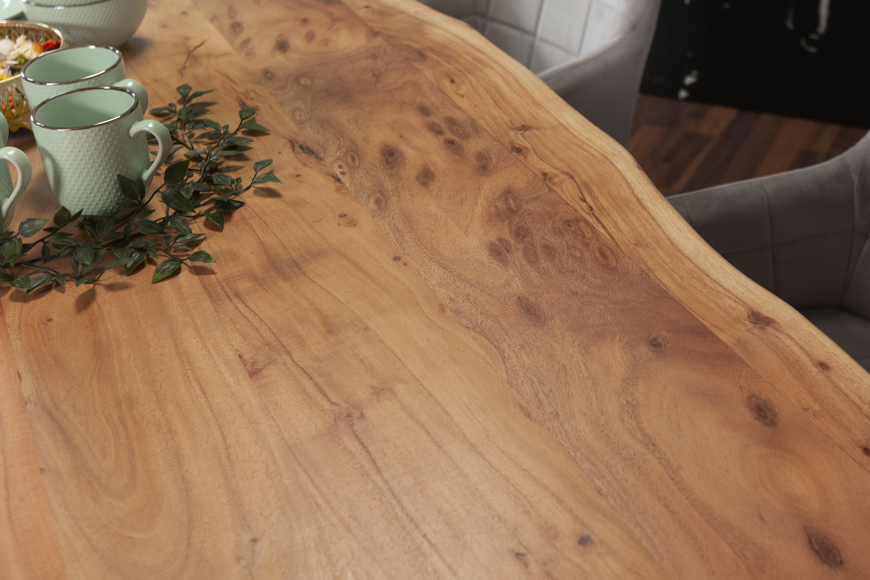 Natur Pur – Besonderes Highlight des Esszimmertisches sind die Tischkanten, die den natürlichen Formen eines Baumes entsprechen und direkt aus dem Baumstamm geschnitten wurden. Da der Tisch ein reines Naturprodukt ist, kann es zu Astlöchern oder unterschiedlichen Farbnuancen kommen.