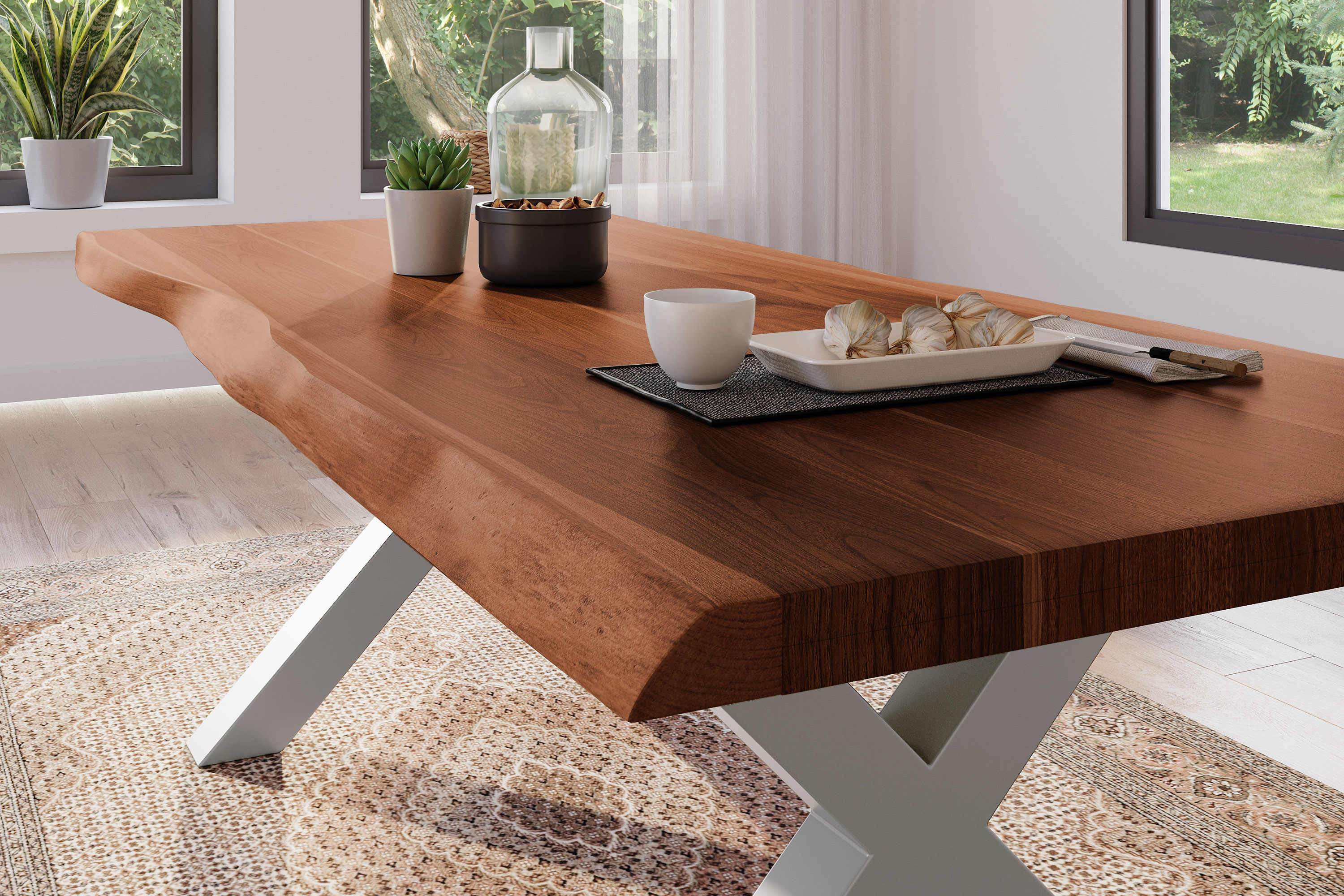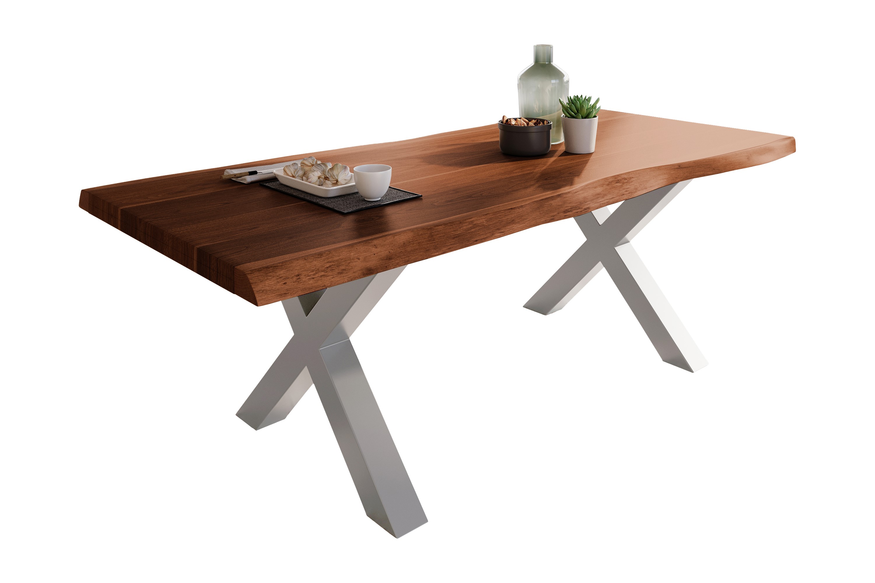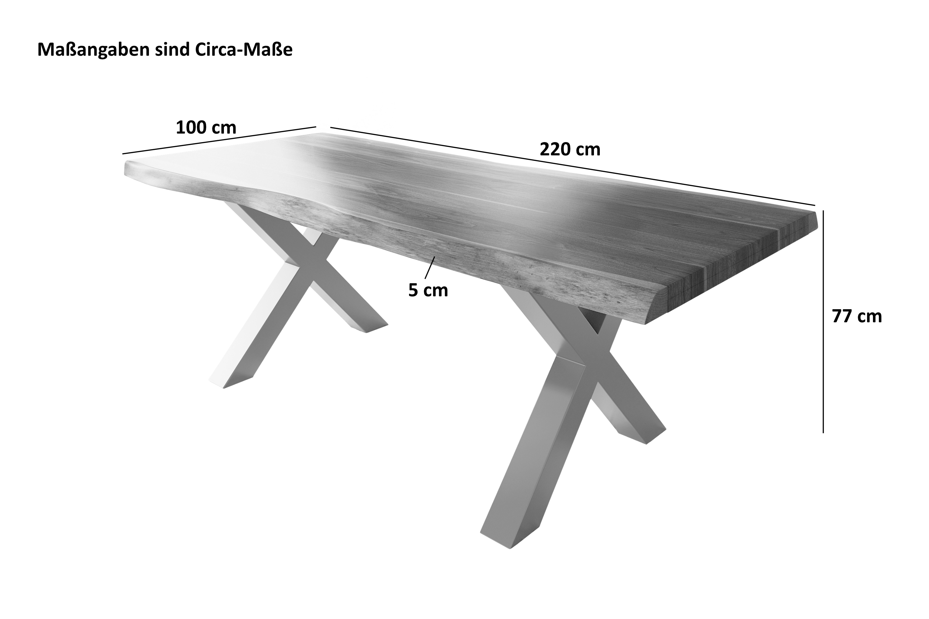 Esszimmertisch Atlas, 220 x 110 cm, massives Akazienholz nussbaumfarben, echte Baumkante, X-Gestell aus Metall Silber