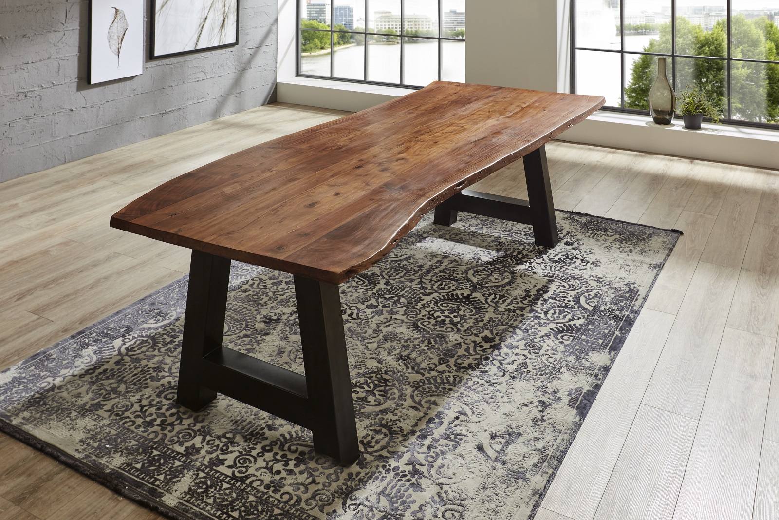 Esstisch Baumkante massiv Akazie nussbaum 200 x 100 A-Gestell schwarz ATHEN
