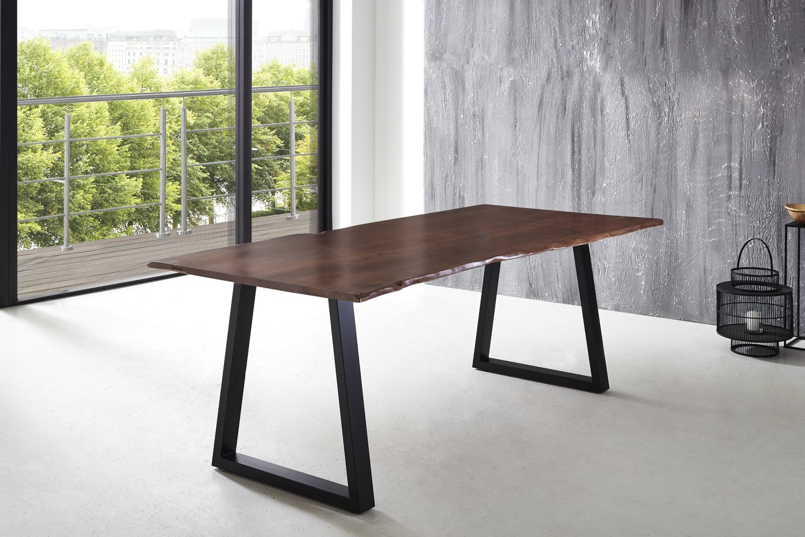 Esstisch Baumkante massiv Akazie nussbaum 220 x 100 schwarz V-Gestell LUBIN