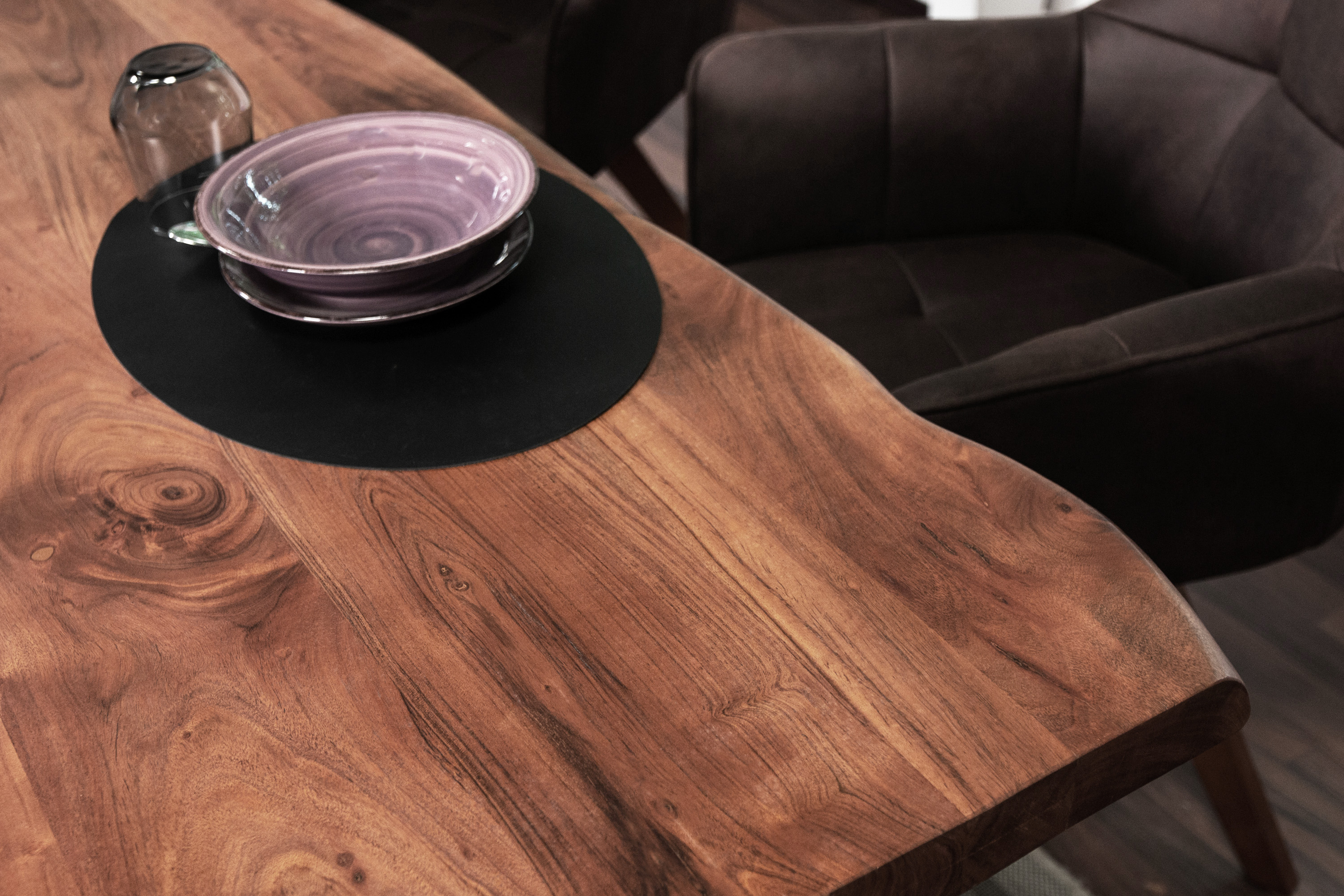 Natur Pur – Besonderes Highlight des Esszimmertisches sind die Tischkanten, die den natürlichen Formen eines Baumes entsprechen und direkt aus dem Baumstamm geschnitten wurden. Da der Tisch ein reines Naturprodukt ist, kann es zu Astlöchern oder unterschiedlichen Farbnuancen kommen.