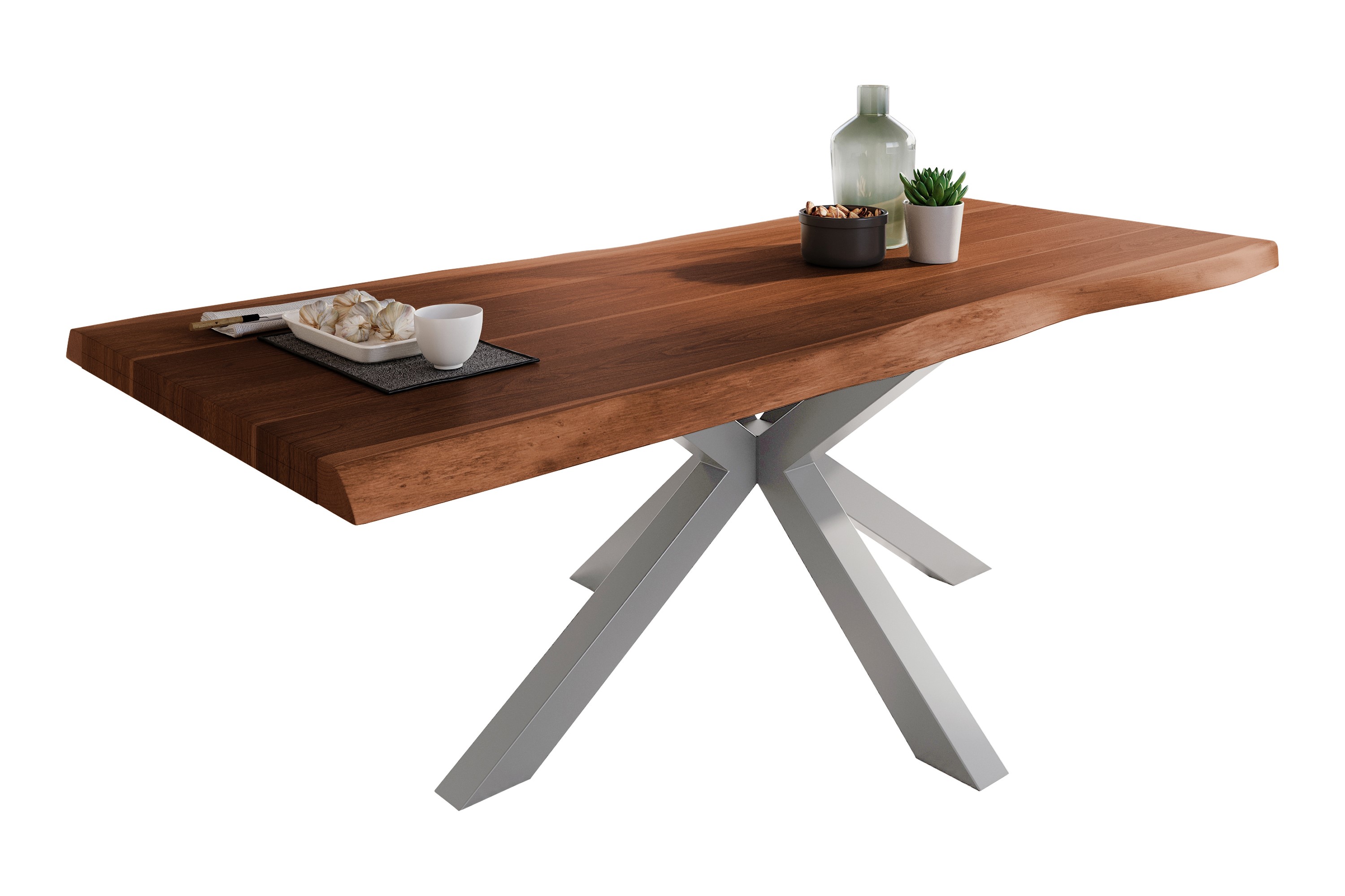 Weiterführende Links zu "Esstisch Baumkante massiv Akazie Nussbaum 220 x 110 Spider-Gestell silber ATLAS"