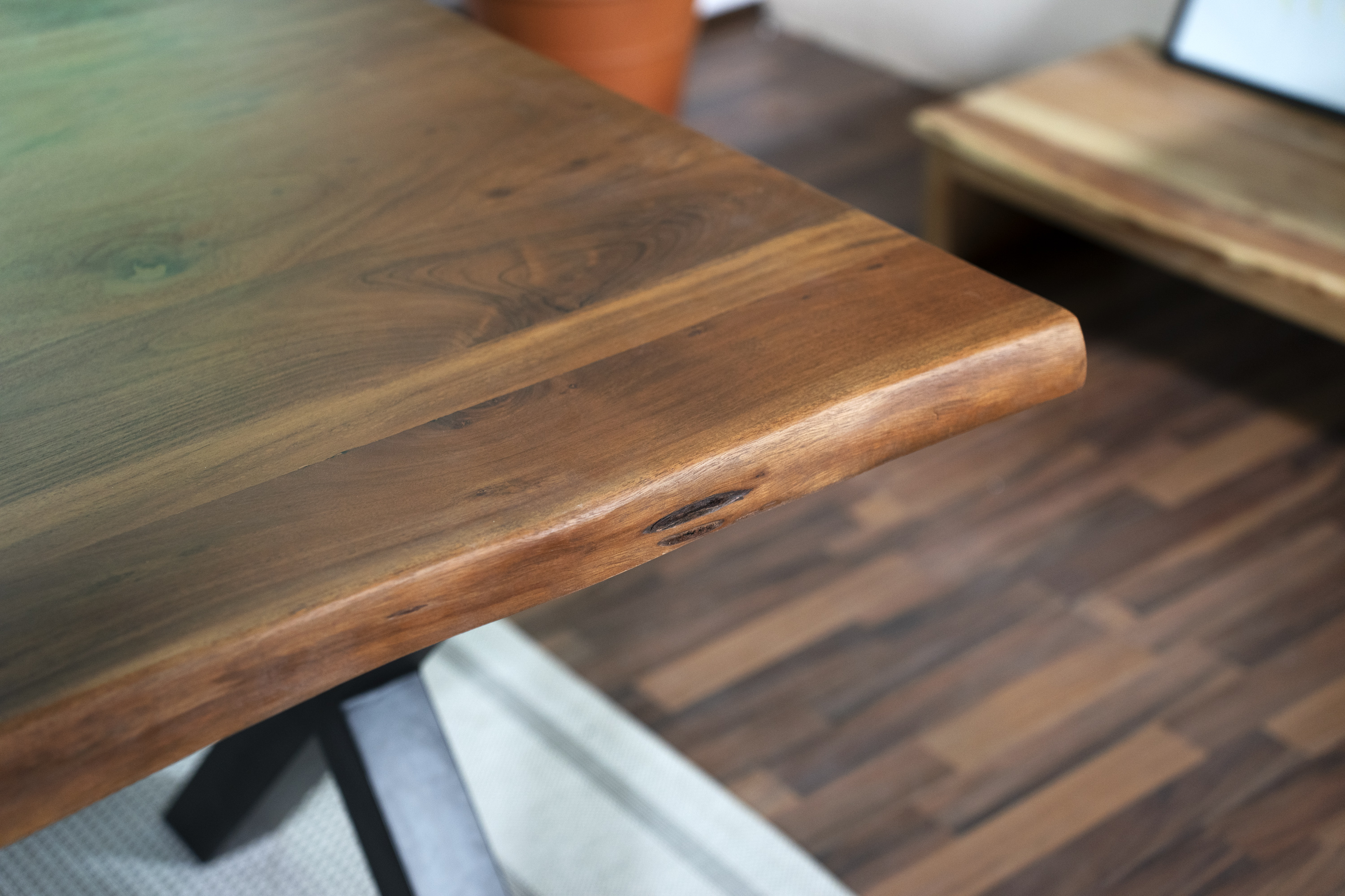 Aufgedoppelte Tischplatte – Die Tischplatte wurde an den Kanten auf 50 mm (25 + 25 mm) aufgedoppelt. Eine aufgedoppelte Platte hat den Vorteil, dass sie wesentlich leichter ist als normale Platten.