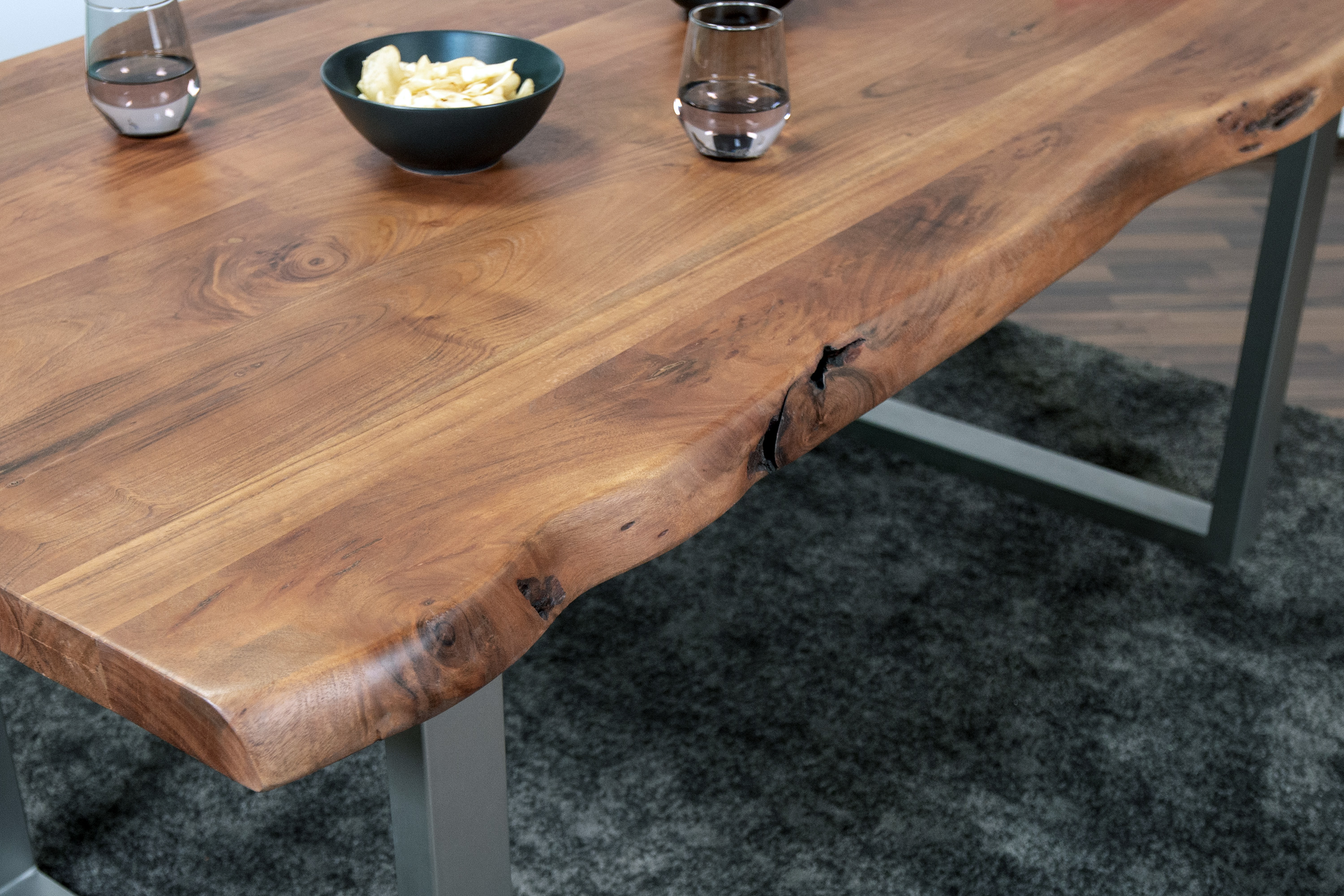 Hochwertiges Unikat – Der Esstisch besteht aus massiven und robusten Akazienholz. Aufgrund der einzigartigen Maserung erhalten Sie ein Unikat mit individuellem Charakter. Das U-förmige Gestell sorgt für einen gelungenen Kontrast, welcher dem Massivholztisch einen Hauch von industriellem Look verleiht.