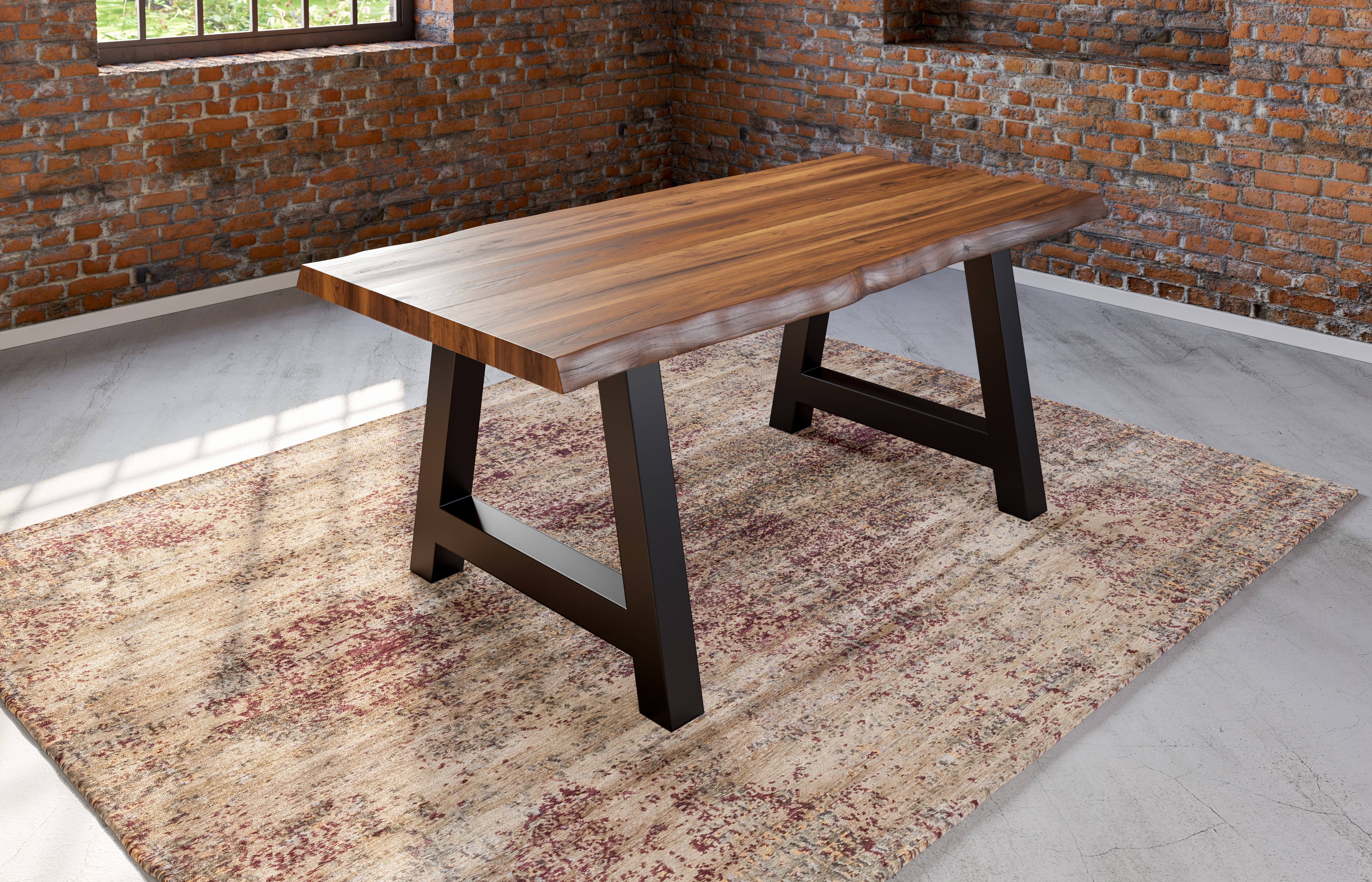 Hochwertiger Esszimmertisch Alicante in der Größe 180x90cm – Akazienholz massiv & nussbaumfarben, echte Baumkante, A-Gestell schwarz