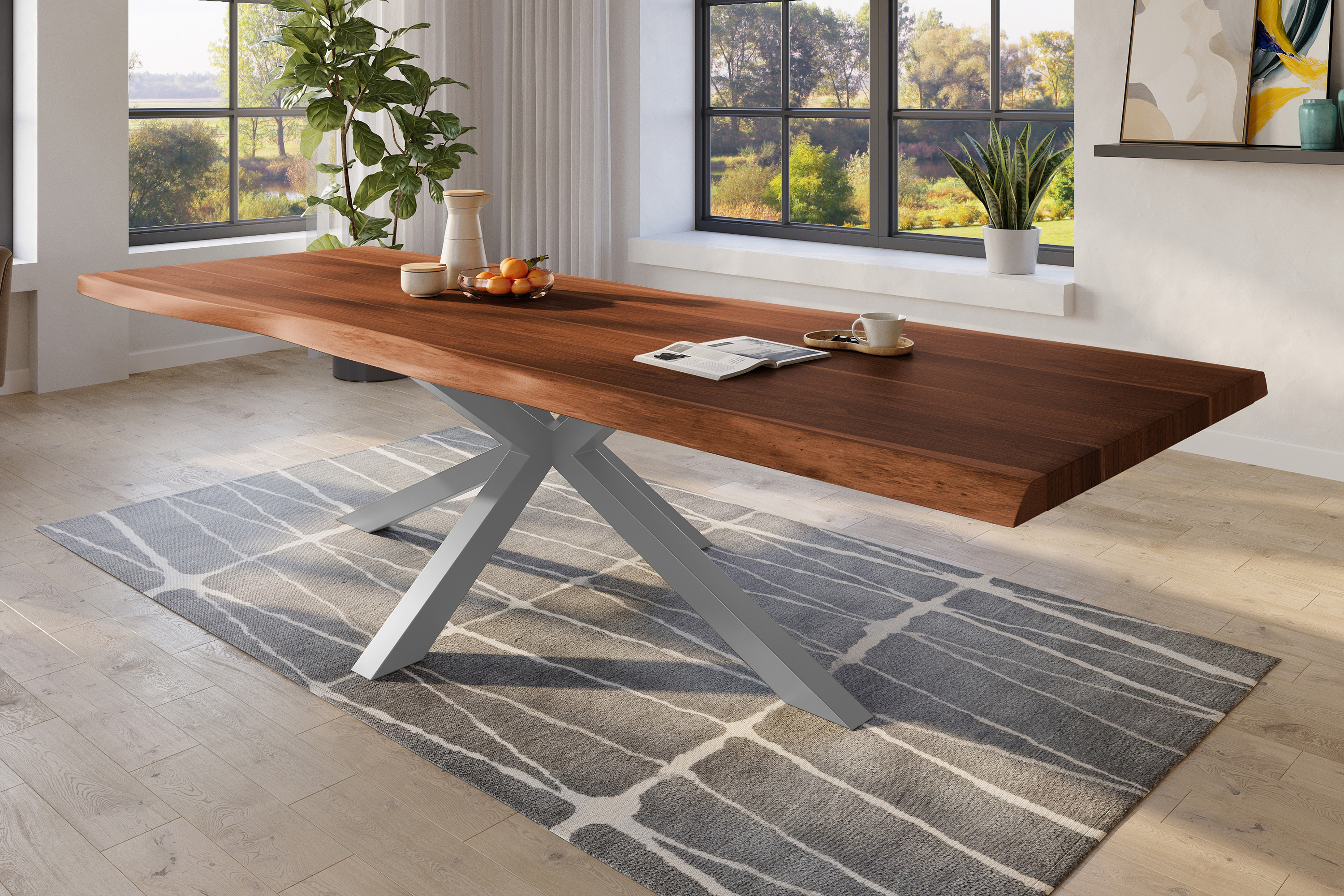 Esszimmertisch Titan, 400 x 120 cm, Akazienholz massiv & nussbaumfarben, Spider-Gestell Metall Silber, echte Baumkante