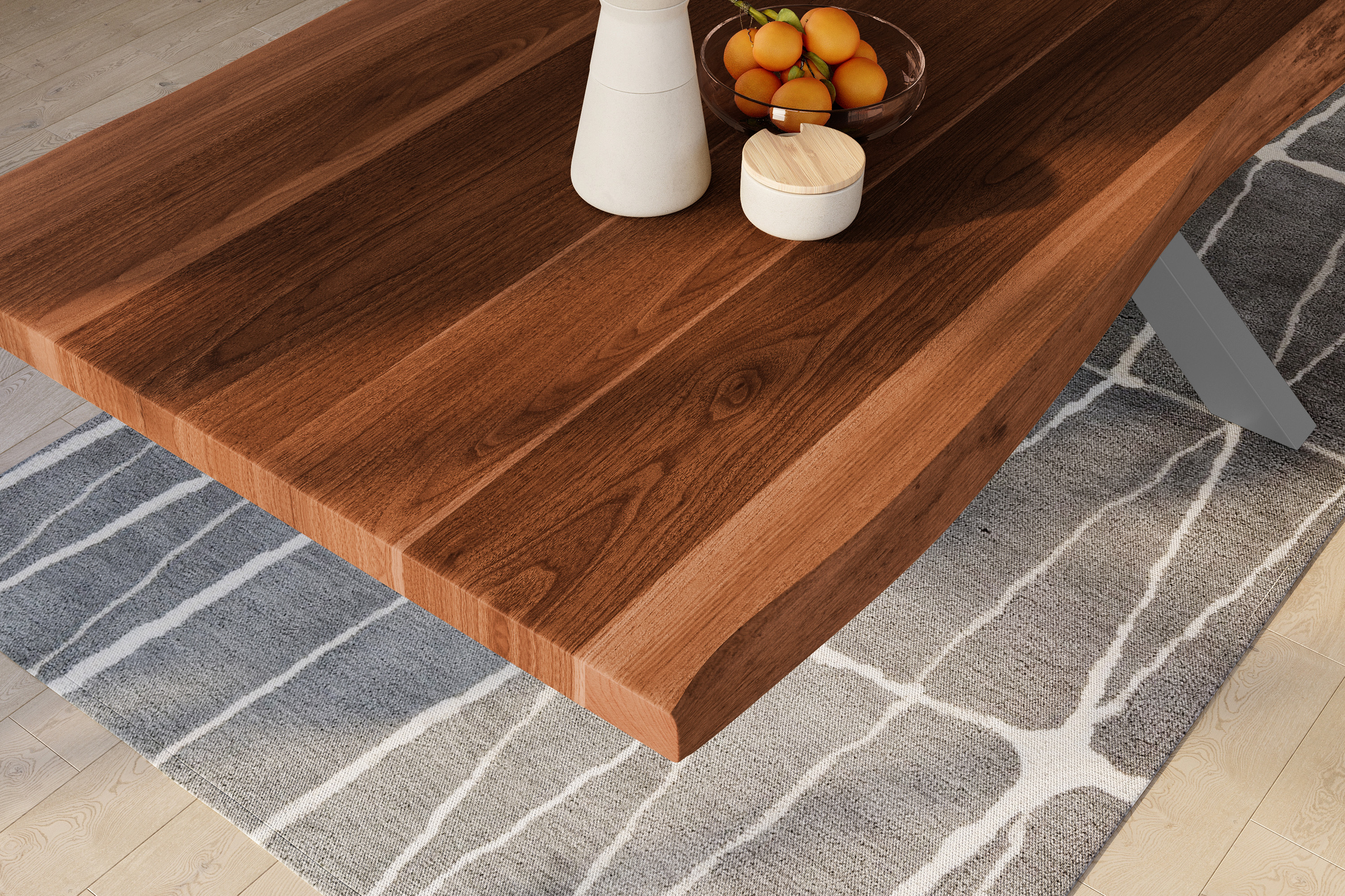 Natürliches Design: Die Tischkanten folgen den natürlichen Formen eines Baumstamms und verleihen dem Tisch eine unverwechselbare Ausstrahlung. Jede Platte ist ein Unikat mit individueller Maserung und charakteristischen Details.